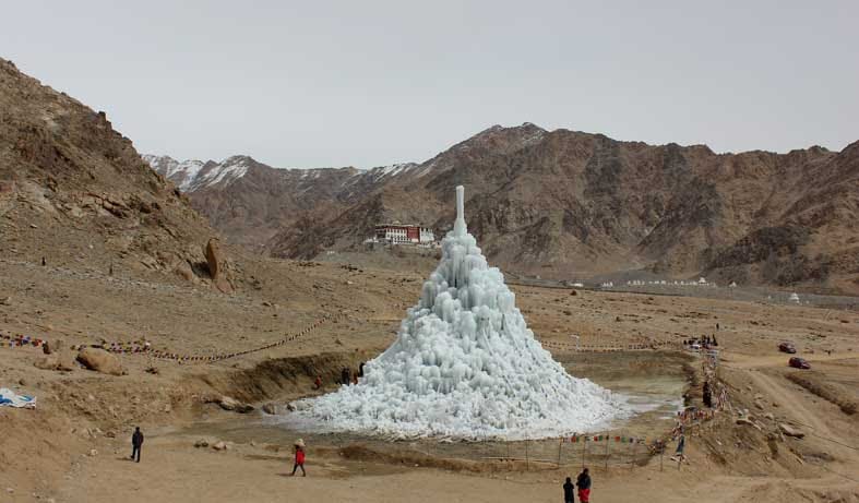 Au printemps, les agriculteurs des régions montagneuses arides du Ladakh sont confrontés à d’importantes pénuries d’eau. Pour les aider, Sonam Wangchuk, ingénieur ladakhi et Lauréat Rolex Awards 2016, a mis au point une solution ingénieuse qui consiste à fabriquer des glaciers artificiels en gelant les eaux de fonte pour former des monticules de glace coniques, semblables aux stupas bouddhistes du Tibet. Ces stupas de glace agissent comme des miniglaciers, qui libèrent progressivement l’eau au début de la saison agricole. Sonam Wangchuk entend créer jusqu’à 20 stupas de 30 mètres de hauteur, chacun pouvant irriguer 50 hectares, et lancer un projet ambitieux de plantation d’arbres dans le désert, une fois le système d’irrigation mis en place. Les cinq stupas construits par l’équipe du Lauréat durant l’hiver 2017-2018 ont stocké environ 30 millions de litres d’eau.