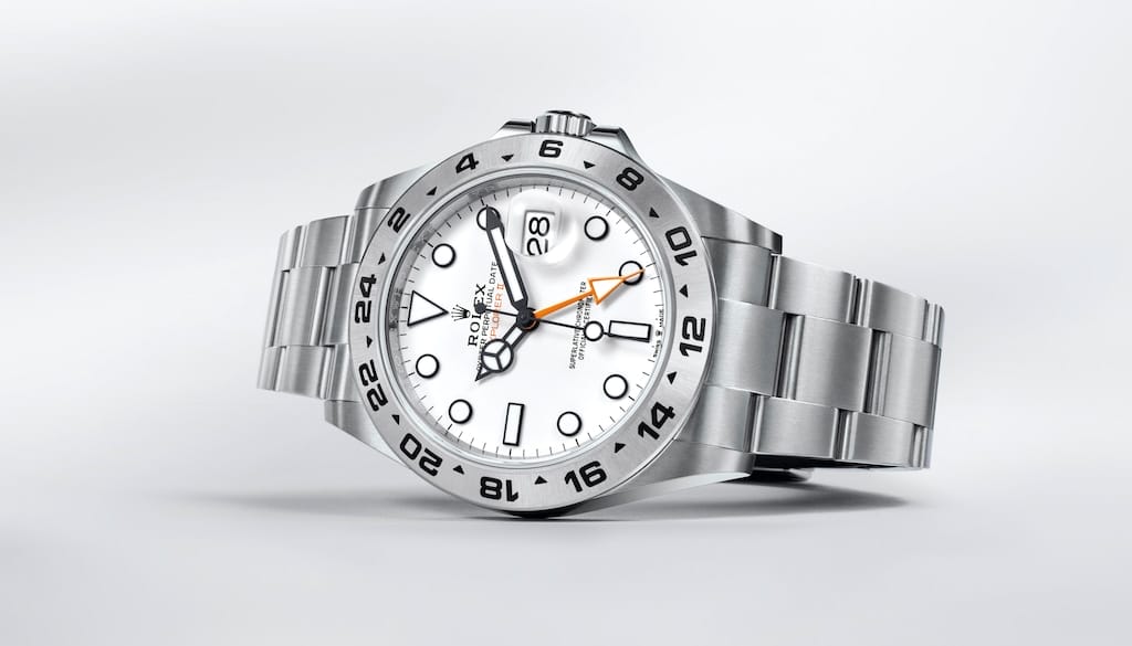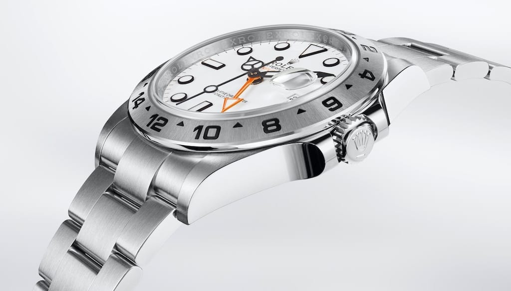 La déclinaison présentée affiche un cadran laqué blanc, sur lequel les index avec revêtement noir par technique PVD (Physical Vapour Deposition) et les aiguilles des heures, des minutes et des secondes laquées noires se distinguent par un rendu mat. L’aiguille 24 heures conserve son emblématique couleur orange, teinte dans laquelle le nom « Explorer II » est inscrit sur le cadran depuis 2011.
