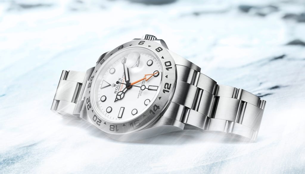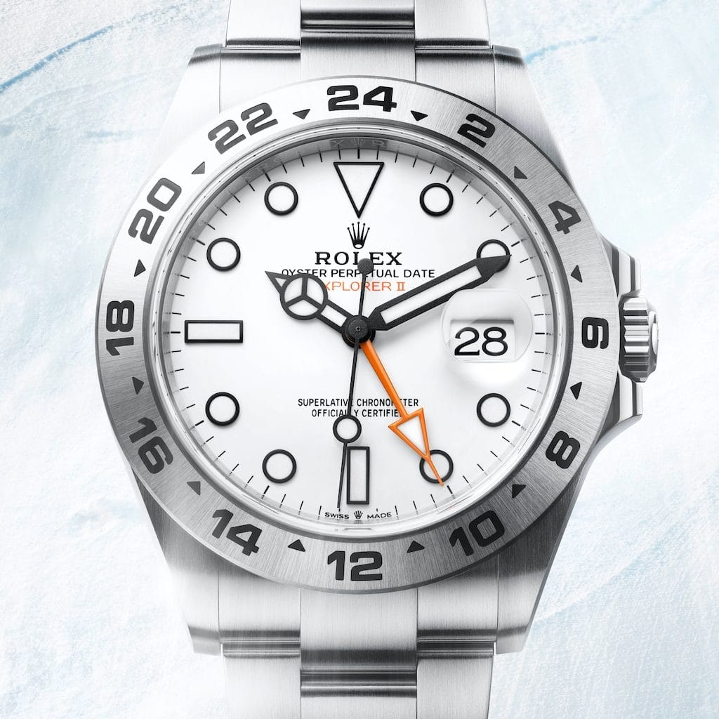 L’Explorer II est l’héritière des liens de longue date qui unissent Rolex et le monde de l’exploration. Présentée en 1971, cette montre robuste et fiable s’est rapidement révélée un élément essentiel de l’équipement de celles et ceux qui s’aventurent aux confins de la Terre, dans des environnements souvent extrêmes. Grâce à son affichage 24 heures constitué d’une aiguille additionnelle orange et d’une lunette gravée, l’Explorer II permet en effet de distinguer sans équivoque les heures du jour de celles de la nuit – une option particulièrement utile dans les zones où l’alternance entre jour et nuit n’est plus clairement établie, voire absente, comme sous terre ou dans les régions polaires, qui connaissent six mois d’obscurité et six mois de lumière du jour. Cet affichage permet aussi, sous certaines conditions, d’utiliser la montre comme boussole. L’affichage 24 heures peut également servir à indiquer l’heure d’un second fuseau horaire.