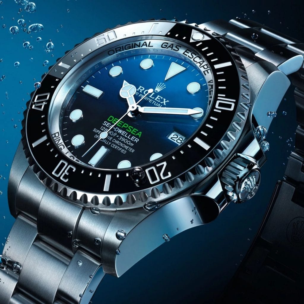 Montre de plongée conçue pour les abysses, la Rolex Deepsea est étanche jusqu’à 3900 mètres. Son boîtier Oyster a été pensé pour garantir une résistance extrême à la pression sous-marine tout en limitant la taille et l’épaisseur de la montre. Il bénéficie de l’architecture Ringlock System brevetée par Rolex, qui lui permet de supporter la pression colossale exercée à ces profondeurs extrêmes. Le Ringlock System est composé de trois éléments : une glace saphir bombée de 5,5 mm d’épaisseur, un anneau de compression haute résistance en acier enrichi à l’azote placé au coeur du boîtier et un fond en acier Oystersteel et titane grade 5. La couronne de remontoir Triplock, munie de trois joints et vissée au boîtier comme une écoutille de sous-marin, garantit l’étanchéité de l’ensemble.