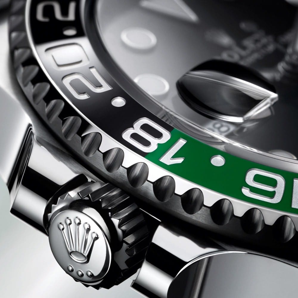Sur la nouvelle déclinaison de la GMT‑Master II, la lunette tournante bidirectionnelle est munie d’un disque Cerachrom gradué 24 heures bicolore en céramique verte et noire. Les graduations et les chiffres, moulés en creux, sont mis en couleur par dépôt de platine selon une technique PVD (Physical Vapour Deposition, dépôt physique en phase vapeur). Grâce à son pourtour cranté qui offre une excellente prise, la lunette peut être manipulée confortablement.