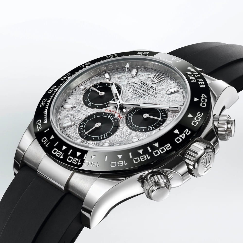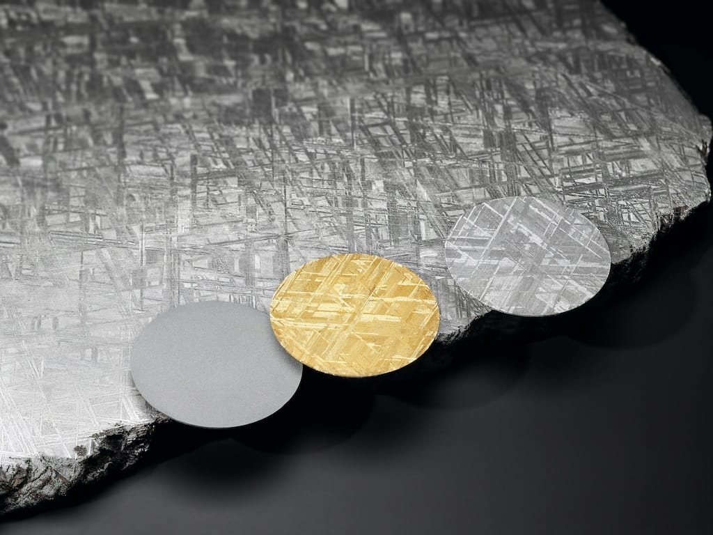 Venue des confins du système solaire, la météorite métallique, matière qui orne le cadran des nouvelles déclinaisons du Cosmograph Daytona, provient d’un astéroïde ayant explosé il y a des millions d’années. Durant leur course interplanétaire, les fragments de cette matière naturelle d’origine extraterrestre et composée essentiellement de fer et de nickel se refroidissent à hauteur de quelques degrés Celsius par million d’années, ce qui génère une cristallisation unique et si particulière, impossible à reproduire sur Terre.