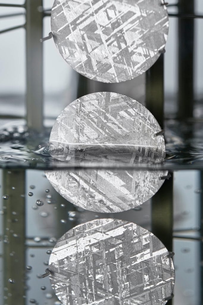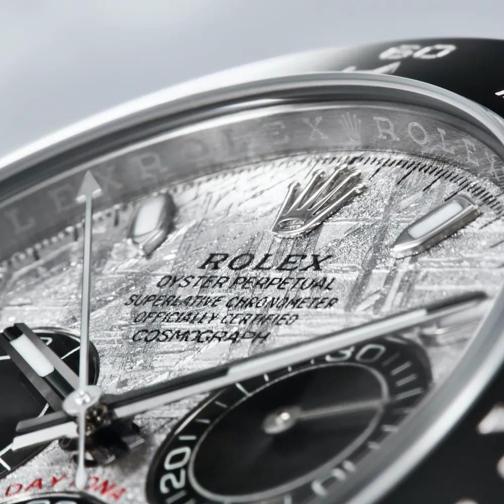 Rare et difficile à travailler, la météorite métallique est découpée en fines lamelles avant de révéler, grâce à un traitement chimique, toute la beauté de sa structure interne évoquant des éclats entrelacés. Ces motifs, aussi imprévisibles que fascinants, sont appelés « figures de Widmanstätten ». Pour ses cadrans en météorite, Rolex collabore avec les experts les plus réputés et retient uniquement les lamelles de météorite dont la surface est particulièrement riche en formes et en reflets.
