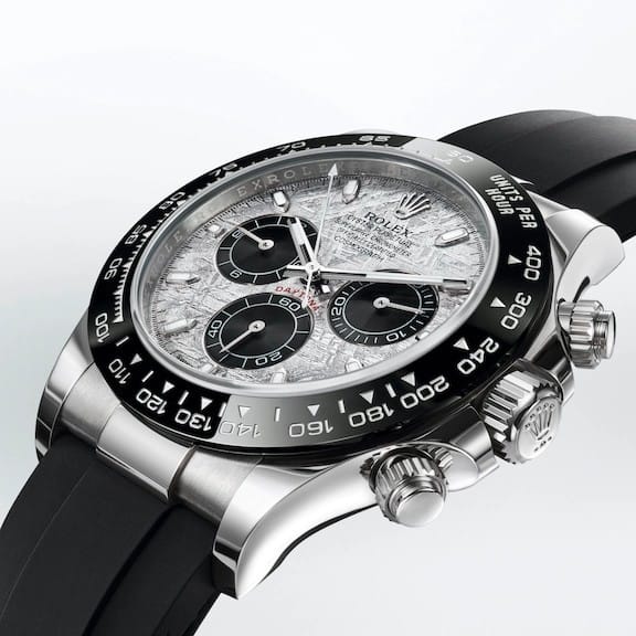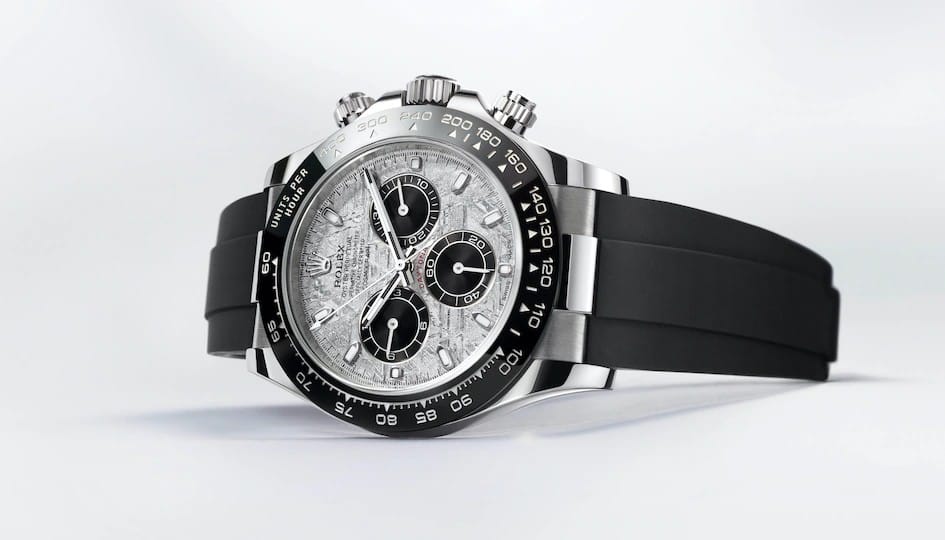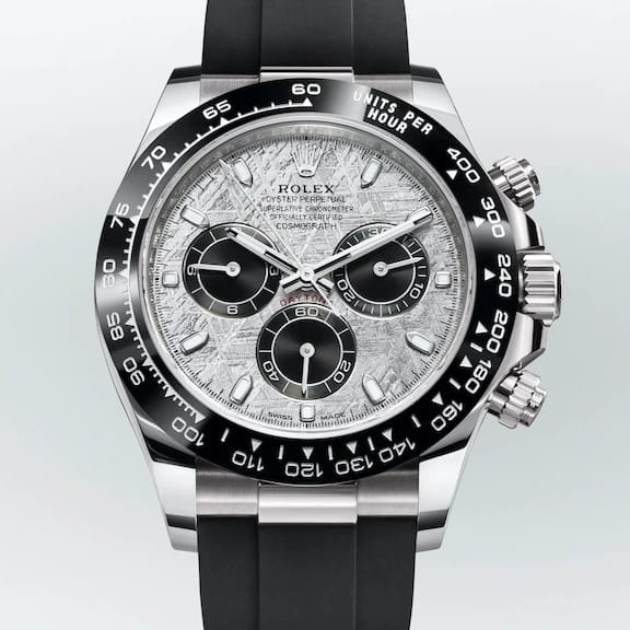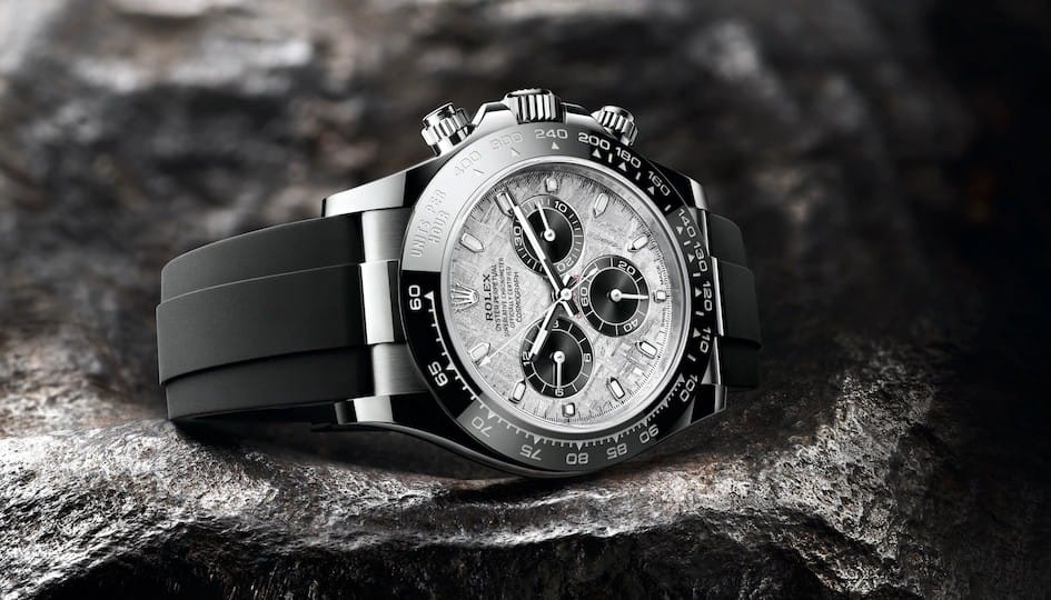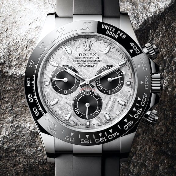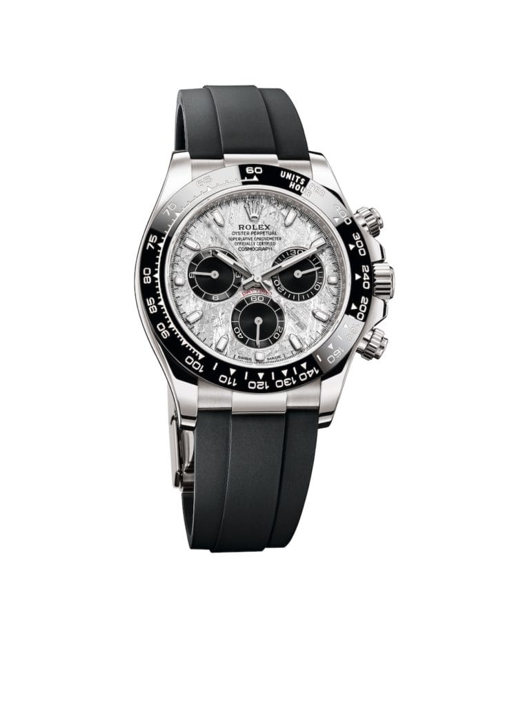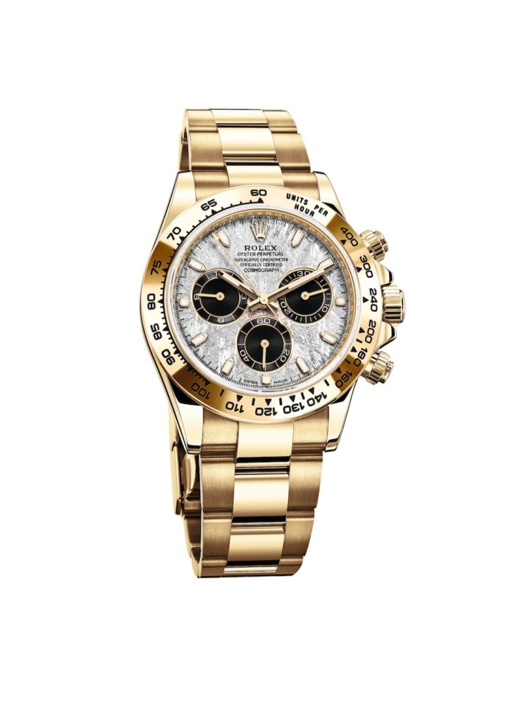 Rolex présente trois déclinaisons exclusives de son Oyster Perpetual Cosmograph Daytona, la montre de référence des passionnés d’automobile et de vitesse. Toutes trois sont dotées d’un cadran réalisé en météorite métallique – une matière naturelle rare venue de l’espace –, sur lequel les compteurs de chronographe à 3 h, 6 h et 9 h sont de couleur noire.