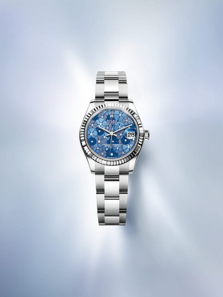 Le cadran décor floral est bleu azzurro sur la première déclinaison, réalisée en version Rolesor gris (combinaison d’acier Oystersteel et d’or gris) et surmontée d’une lunette cannelée. Il s’affiche respectivement en vert olive sur la deuxième montre, façonnée en or jaune 18 ct, et en argenté sur la dernière, en version Rolesor Everose (combinaison d’acier Oystersteel et d’or Everose), toutes deux dotées d’une lunette sertie de 46 diamants taille brillant et assorties, pour l’une, d’un bracelet President, pour l’autre, d’un bracelet Jubilee.