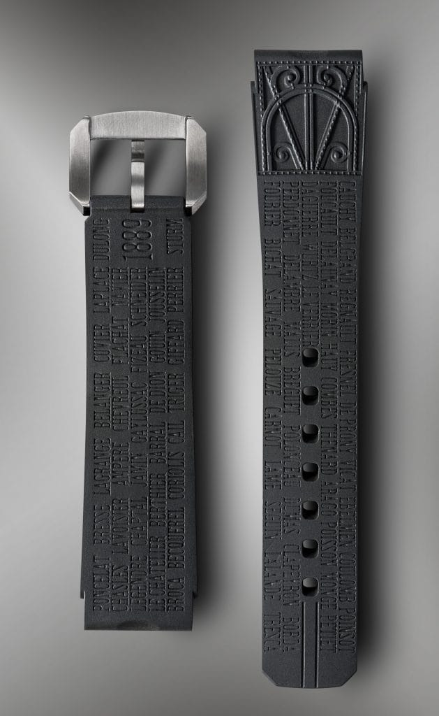 Baptisée « Tour Eiffel 1885 », en écho à l’année de fondation de SAINT HONORE, cette édition rend un hommage inédit à la tour Eiffel. Elle ajoute à sa lunette confectionnée à partir de l’acier de la « Dame de Fer » un bracelet intégrant lui aussi du métal provenant du célèbre monument. La nouvelle montre « Tour Eiffel 1885 » est en effet équipée d’un bracelet constitué d’un mélange de polyuréthane et de poudre d’acier de l’édifice. Grâce à un ingénieux processus, la matière obtenue présente, une fois refroidie, une séduisante et étonnante patine métallisée en surface. Fabriqué un à un selon une technique artisanale, aucun bracelet ne ressemble à un autre. Chacun d’eux est une pièce unique.