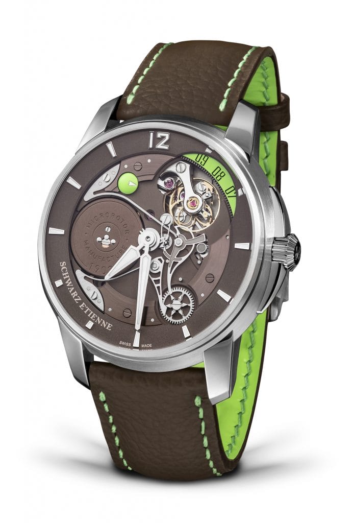 Le disque de date se dévoile à 2 heures. Un original et discret indicateur de secondes à 11 heures et le balancier orné du logotype Schwarz Etienne animent cette sculpture mécanique. D’élégantes aiguilles de type Alpha, recouvertes de matière luminescente marquent les heures et les minutes