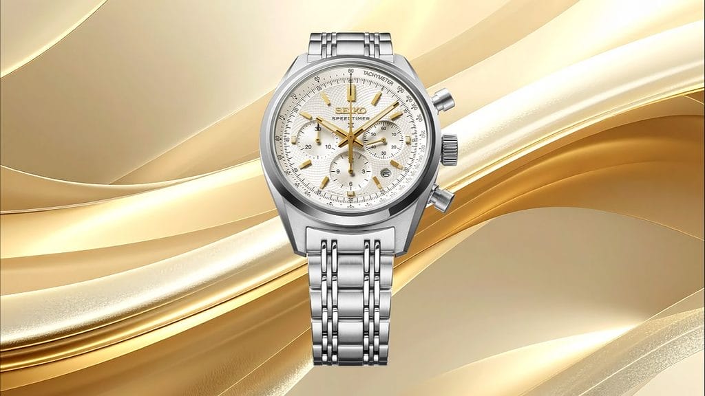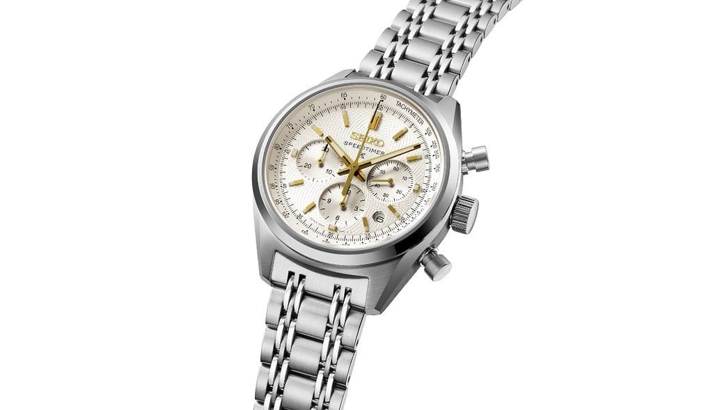 Le nouveau chronographe mécanique Prospex Speedtimer anniversaire reprend cet héritage avec un cadran blanc orné d’un motif inspiré des gravures historiques de Kintaro Hattori. Les aiguilles, index et logo Seiko adoptent une teinte dorée qui contraste élégamment avec le fond clair, renforçant la lisibilité, signature de la ligne Prospex.