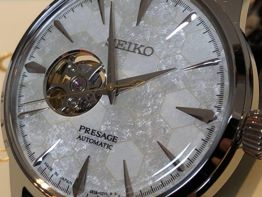 Cette montre a pour particularité d’avoir un cadran très original. Par sa « texture » et par son « design ». Les motifs embossés sont de type filandreux. Il y a un rappel dans le dessin des motifs qui n’est pas sans évoquer une forme de fibres naturelles. La succession d’exagones est un rappel du motif « nid d’abeille », faisant référence au miel produit à Ginza et utilisé dans le cocktail « Honeycomb ». La couleur avec ses variantes de gris clair et de doré léger, rappelle la couleur de ce même cocktail. Rien n’est laissé au hasard…