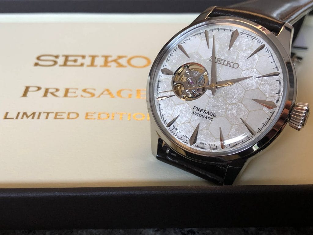 Cette Seiko Cocktail Présage « Star Bar édition » est limitée à 6 000 montres pour le monde. Ce modèle est inspiré d’un cocktail créé par le barman du « Star Bar », célèbre établissement japonais situé dans le quartier de Ginza, à Tokyo. Ce cocktail est le Honeycomb, fabriqué par Hisashi Kishi, le chef barman du « Star Bar » à base de miel récolté à Ginza.