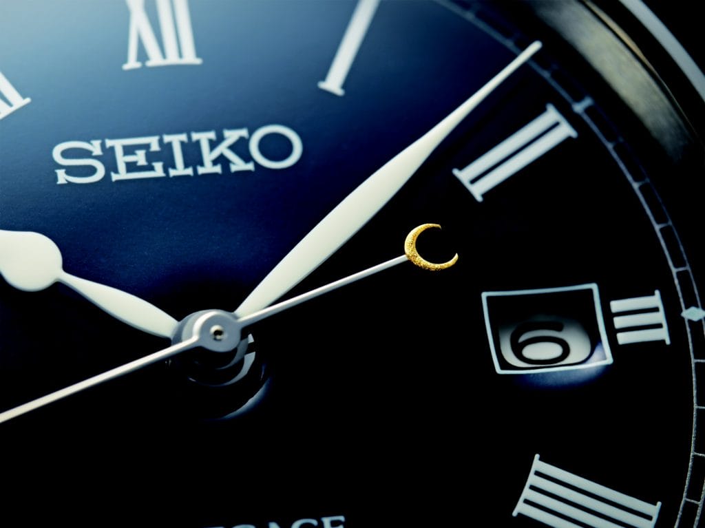 L’héritage de Seiko et la passion du Japon pour la lune sont tous deux exprimés dans le design de ce garde-temps. La forme des index est inspirée de la première montre de poche de Seiko, la ‘Time Keeper’, manufacturée en 1895. La pointe profilée en demi-lune de l’aiguille des secondes est revêtue d’une poudre couleur or lui conférant une texture spéciale rappelant la surface de la lune et la forme de son croissant est visible sur le fond de boîtier en saphir, fixé par dépôt en phase vapeur. Dans un souci d’harmonie avec le cadran, son bracelet en crocodile est d’un bleu profond et son éclat délicat reflète de manière subtile la lumière. Tous ces éléments combinés donnent naissance à une montre qui impressionne par la noblesse classique de son design, mais nous touche néanmoins également par une forme d’humanité et une chaleur qui attirent le regard. Elle invite à être prise en main, examinée de près et pleinement découverte.