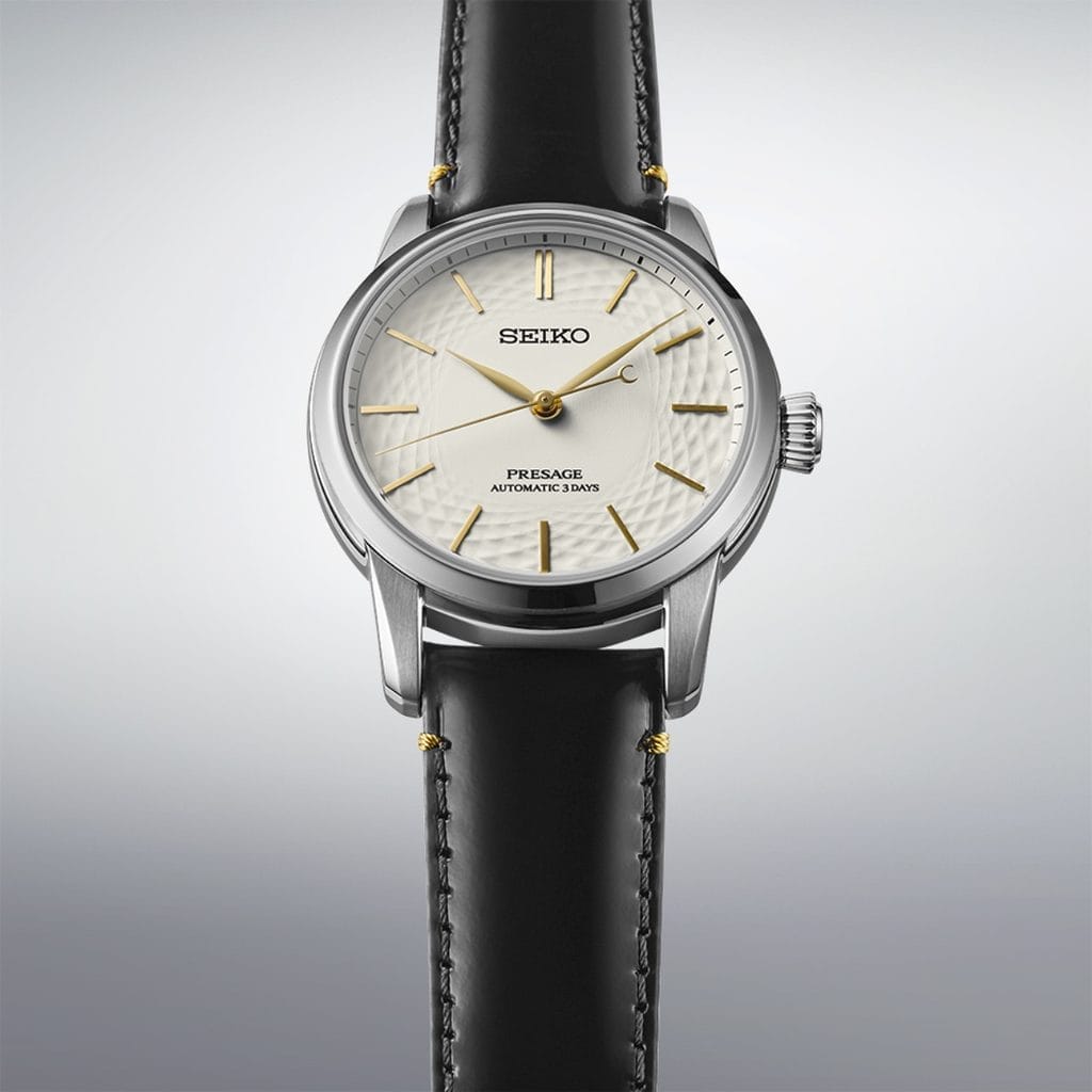 Au centre du cadran, un motif en losange finement texturé fait écho aux traditions esthétiques japonaises. Il évoque à la fois la prospérité, la santé et l’harmonie, tout en structurant le regard autour des index appliqués dorés et des aiguilles assorties, qui brillent par leur élégance sans ostentation.