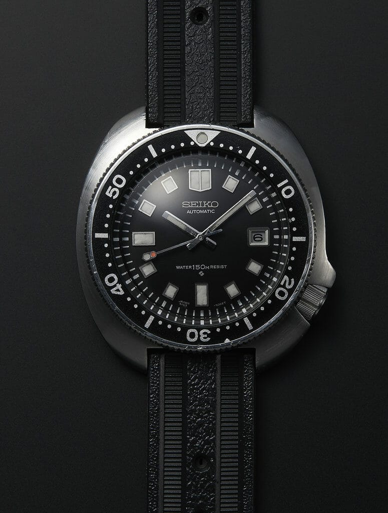 Cinq ans après avoir conçu sa toute première montre de plongée – et celle du Japon – en 1965, Seiko a présenté une nouvelle montre de plongée avec un boîtier au design fluide et une extension asymétrique qui protège la couronne à quatre heures. Dotée d’une conception solide, d’une résistance à l’eau de 150 mètres et d’aiguilles et index luminescents, elle était parfaite pour ceux qui avaient besoin d’un garde-temps d’une fiabilité et d’une lisibilité maximale.