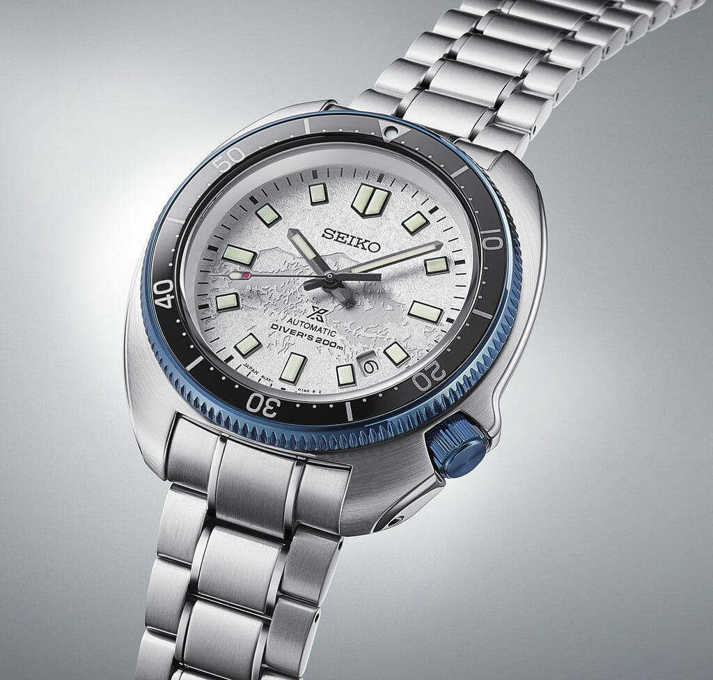 Aujourd’hui, les cinq montagnes escaladées par Uemura sont commémorées avec une réinterprétation moderne de la montre de plongée de 1970 dont le cadran représente le Mont Blanc, son premier exploit.