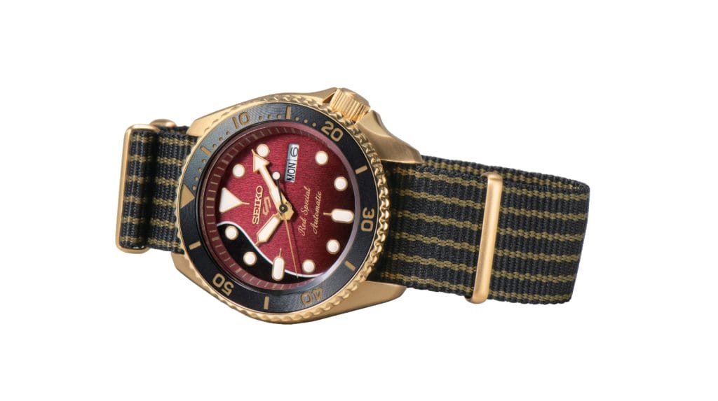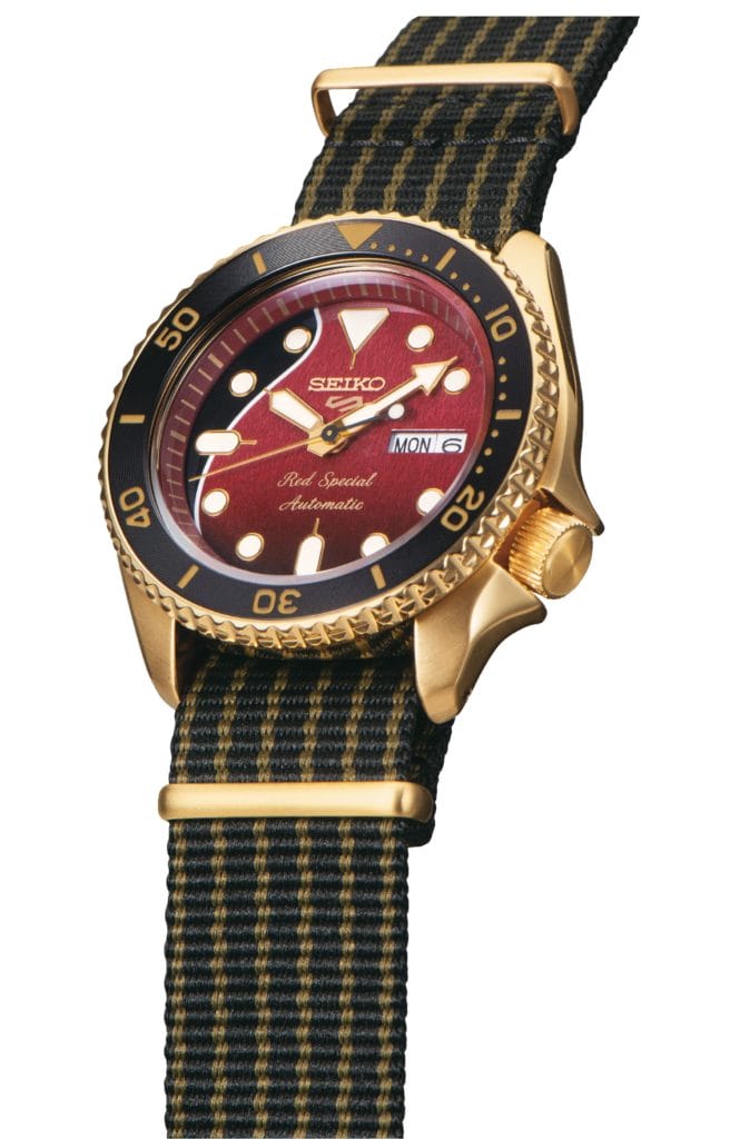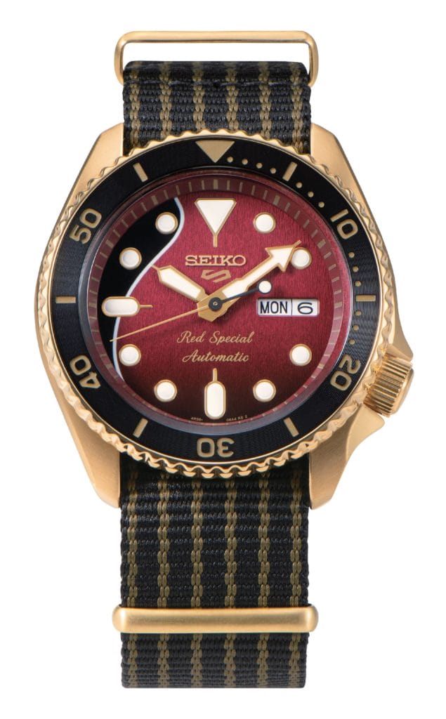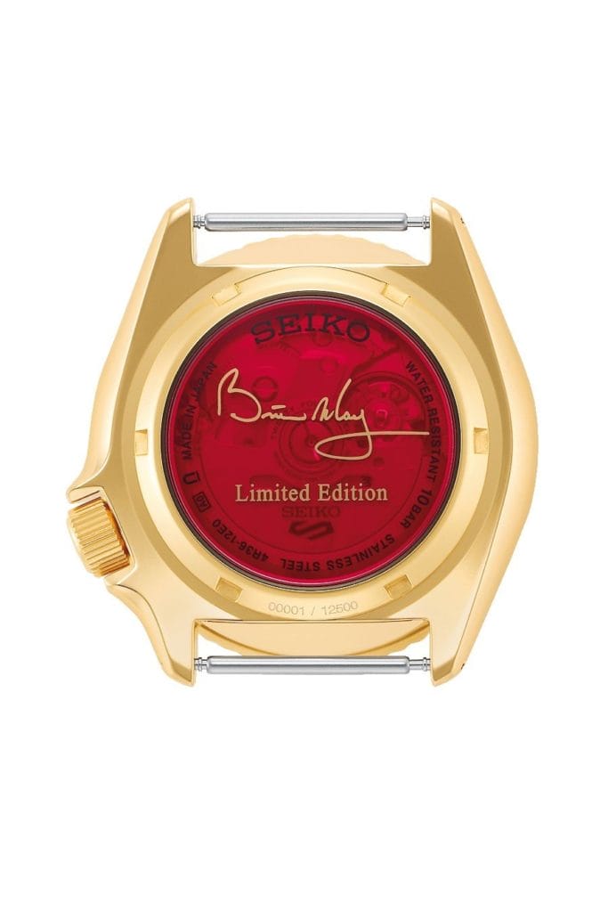 Seiko 5 Sports présente son second modèle en collaboration avec Brian May, guitariste du légendaire groupe de rock QUEEN ! La guitare préférée de Brian, la « Red Special », inspire ce modèle de couleur or en édition limitée.