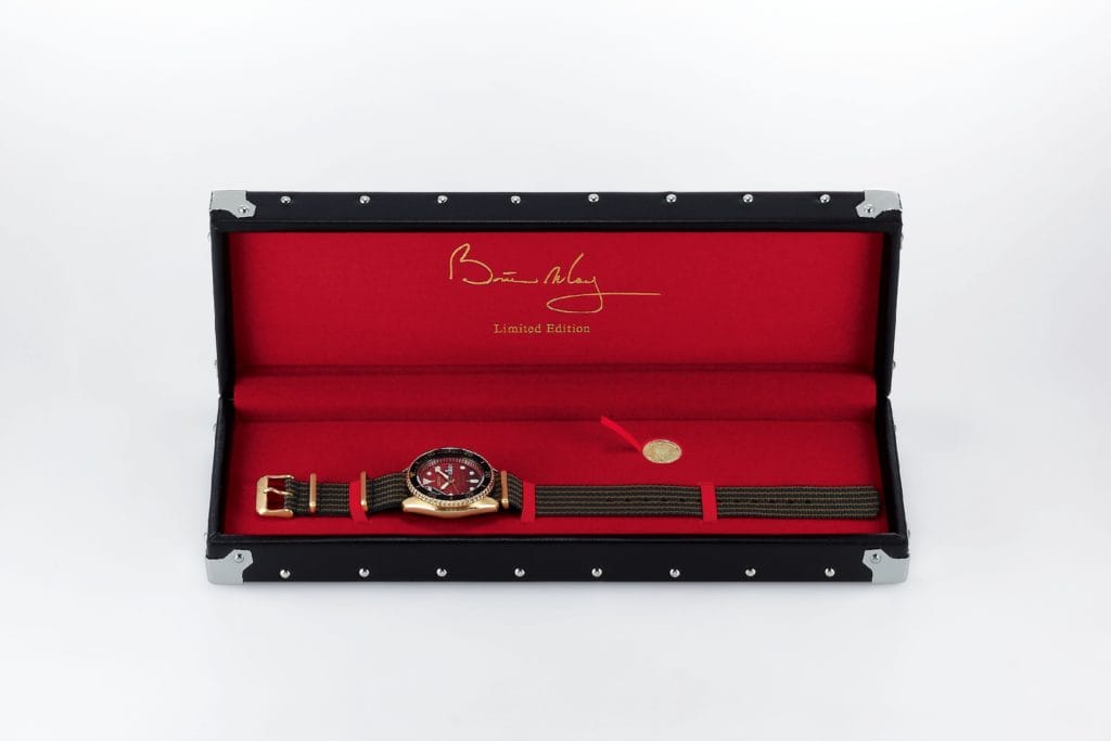 La montre est présentée en édition limitée avec la signature de Brian sur le fond du boîtier à côté de « LIMITED EDITION » et du numéro de série 00001/12500 – 12500/12500.
