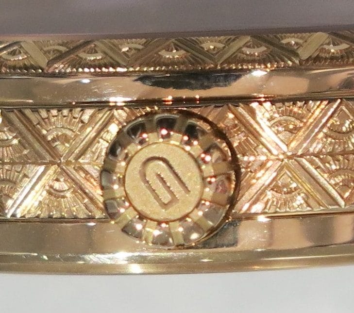 L’autre spécificité de cette œuvre d’art en est bien sûr le boîtier et la lunette décorés par le maître-graveur Kiss Engelbarts, compatriote des frères Grönefeld. Le motif géométrique Art Déco est ciselé à la perfection jusque sur les cornes.