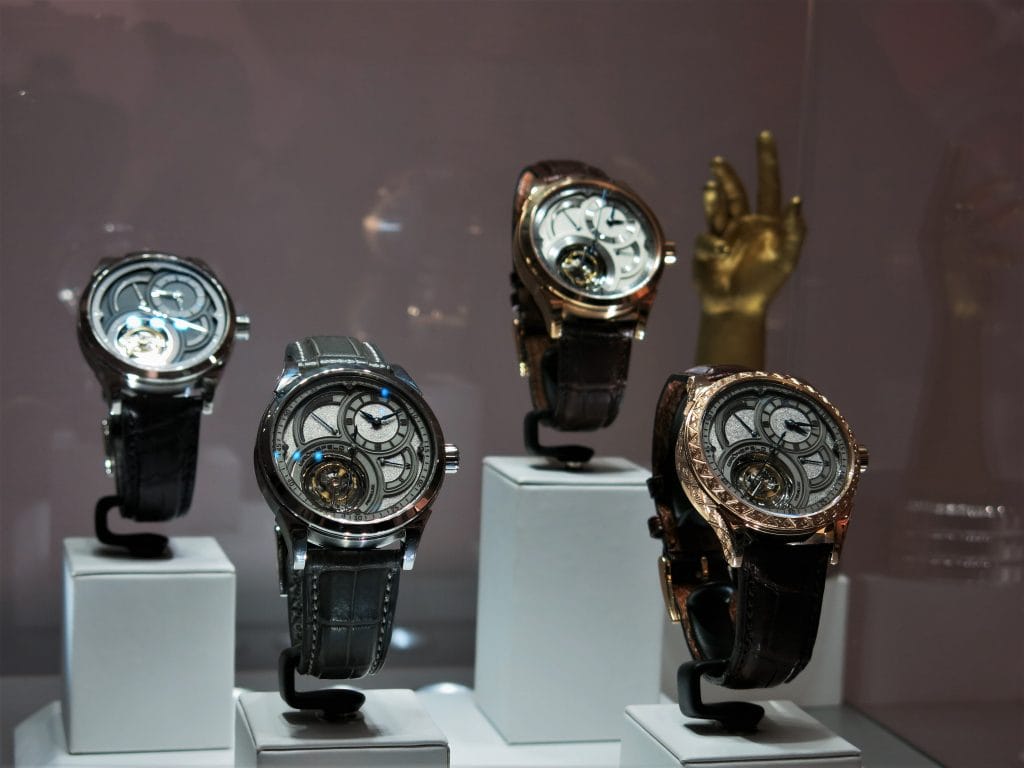 Dans la collection Parallax Tourbillon (modèle primé au GPHG 2014) , Tim et Bart nous ont réservé sur le Salon la présentation d’une autre pièce unique qui bénéficie d’un tout nouveau cadran en acier inoxydable martelé à la main produit sur commande. Ici en avant-plan de la vitrine : à gauche, la version sur boîtier lisse – à droite, la pièce unique au boîtier en or rose gravé.