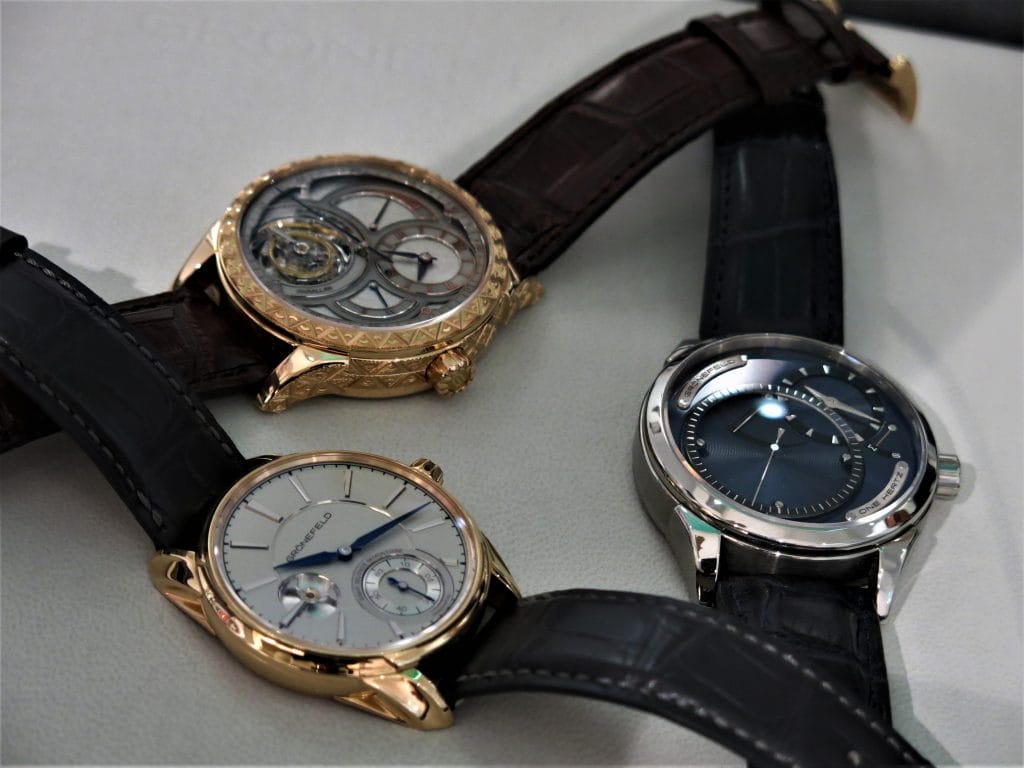 L’occasion d’une dernière photo de famille avec ces déclinaisons des 3 modèles des collections Grönefeld, y compris la One Hertz ici dans sa rare combinaison titane et cadran bleu.