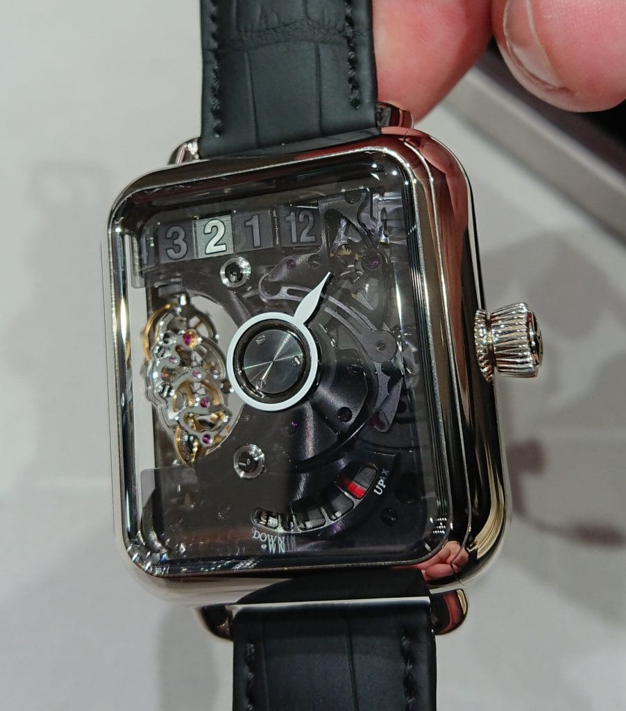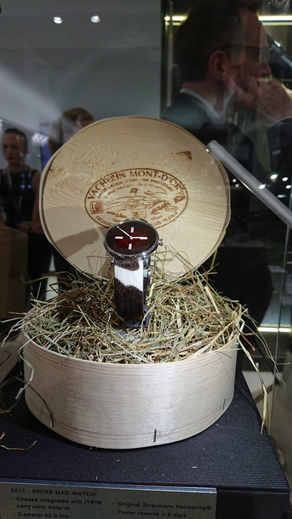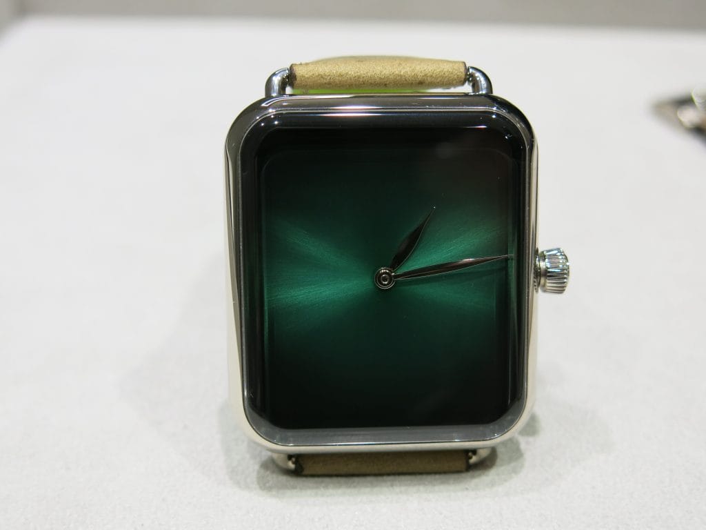 Dans une autre vitrine, l’une des déclinaisons de la Swiss Alp Watch, clin d’œil délicieux et bien sûr intégralement mécanique à une célèbre montre connectée.