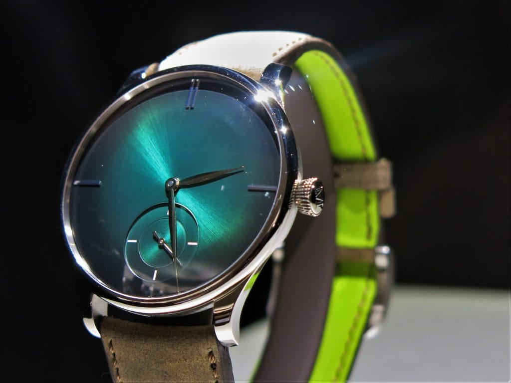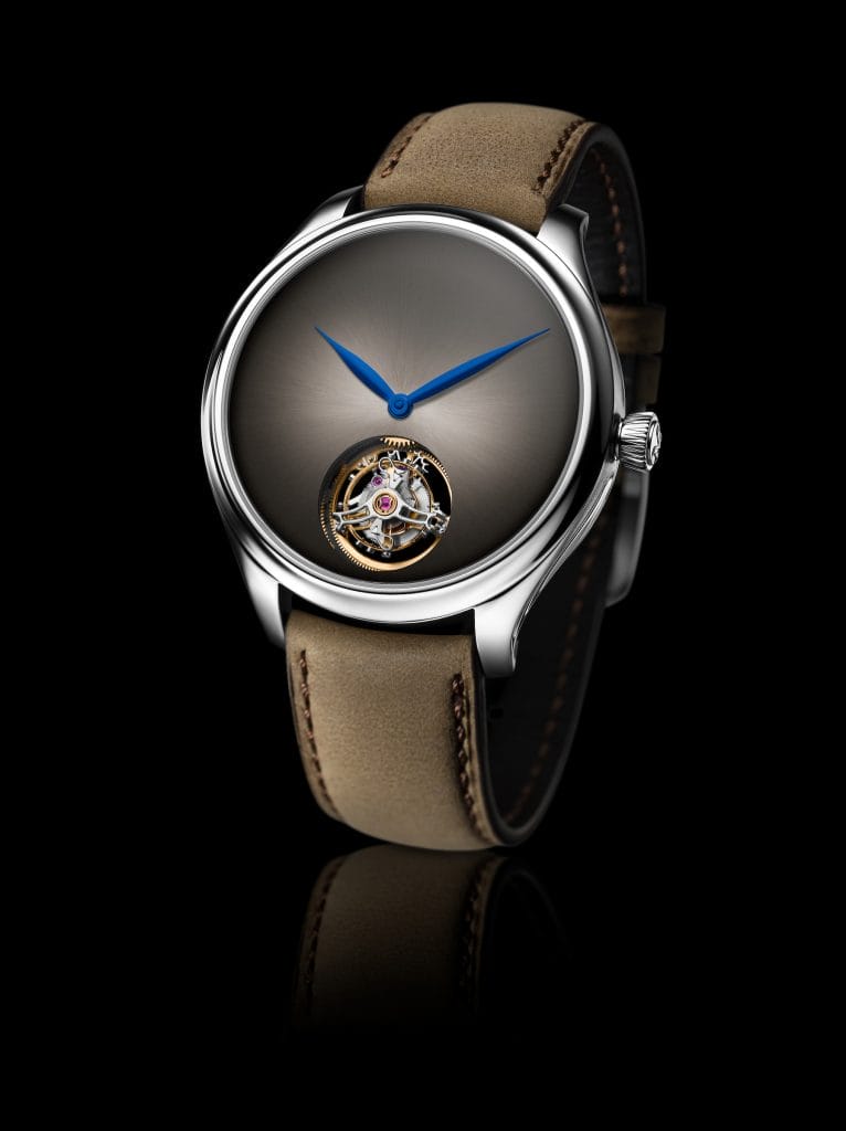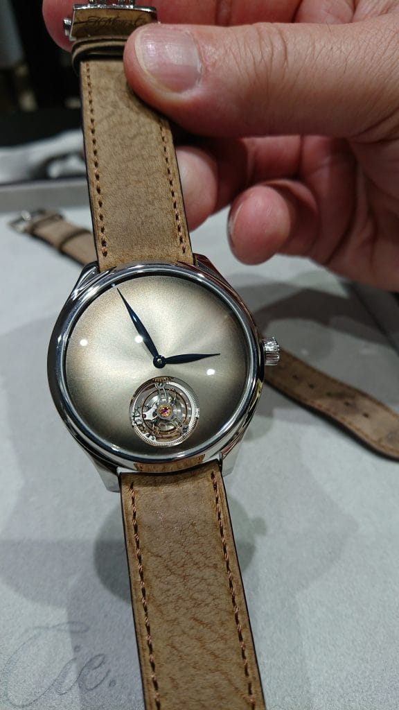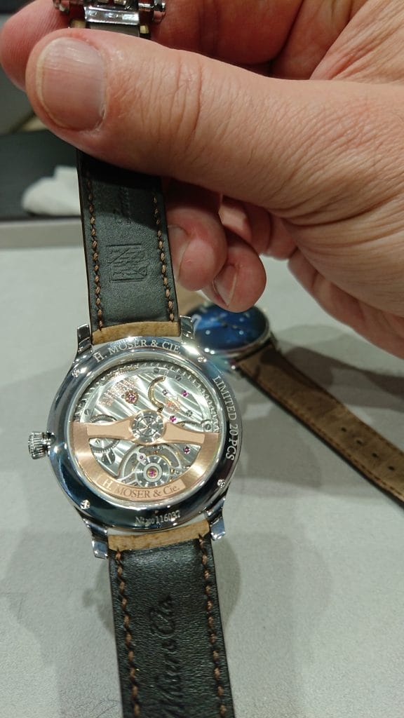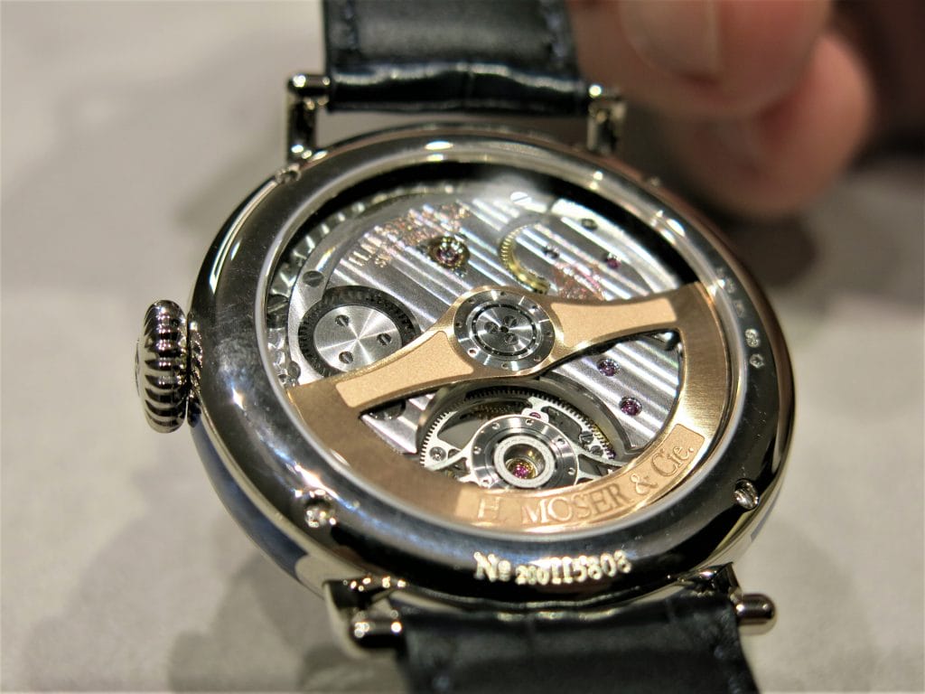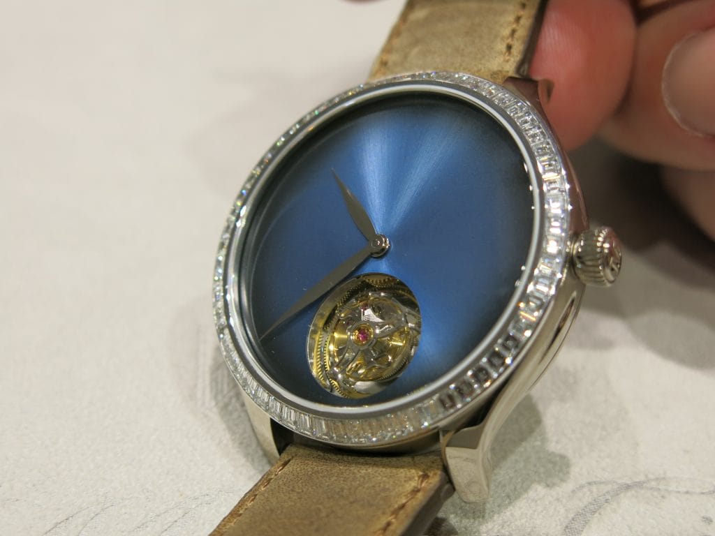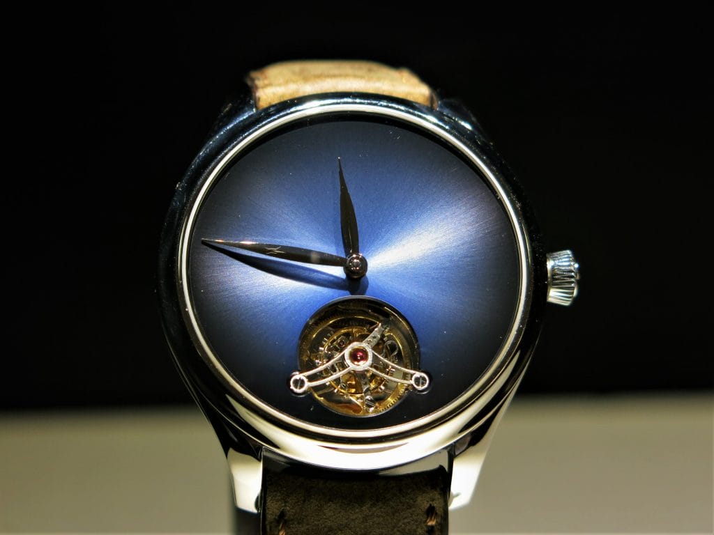 Fin 2017 à la Dubai Watch Week, H. Moser & Cie nous avait régalés d’un magnifique Tourbillon Concept dans la ligne Endeavour. En or blanc et cadran Funky Blue, limité à 20 exemplaires, ce modèle était présenté au SIHH en vitrine.