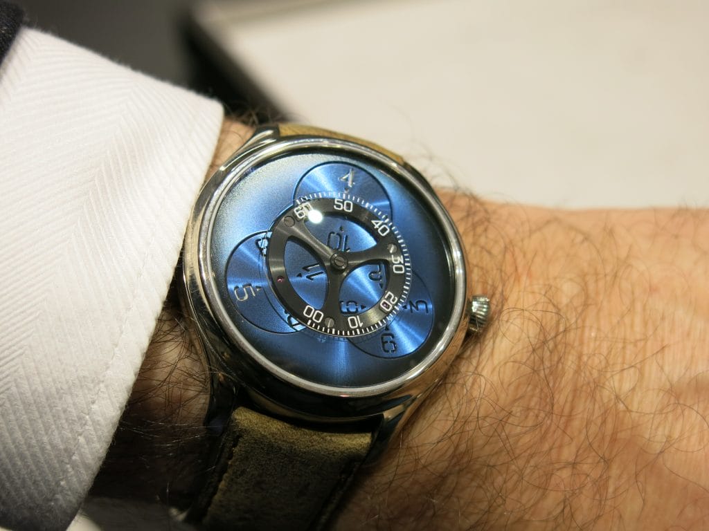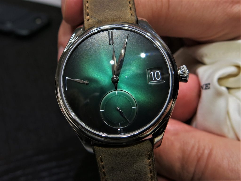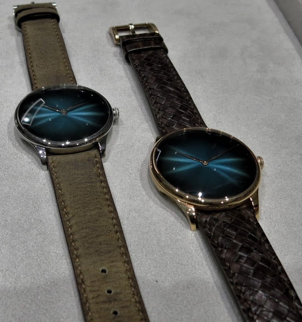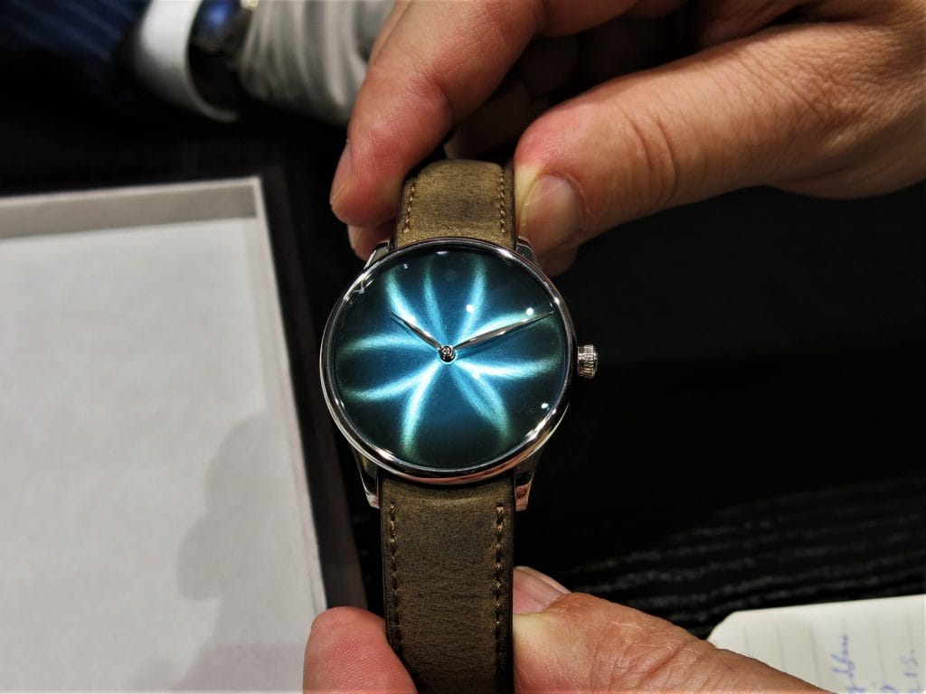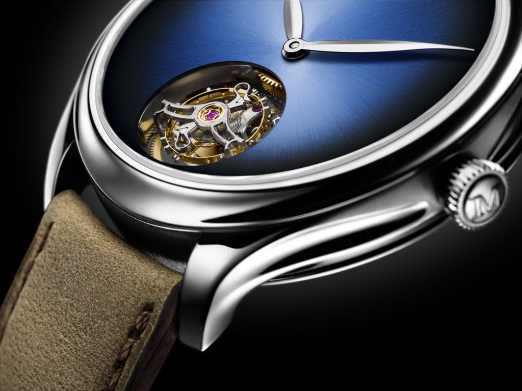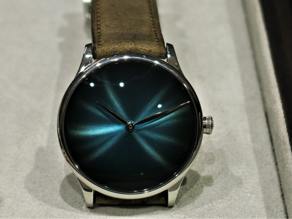 Fin 2017 à la Dubai Watch Week, H. Moser & Cie nous avait régalés d’un magnifique Tourbillon Concept dans la ligne Endeavour. En or blanc et cadran Funky Blue, limité à 20 exemplaires, ce modèle était présenté au SIHH en vitrine.