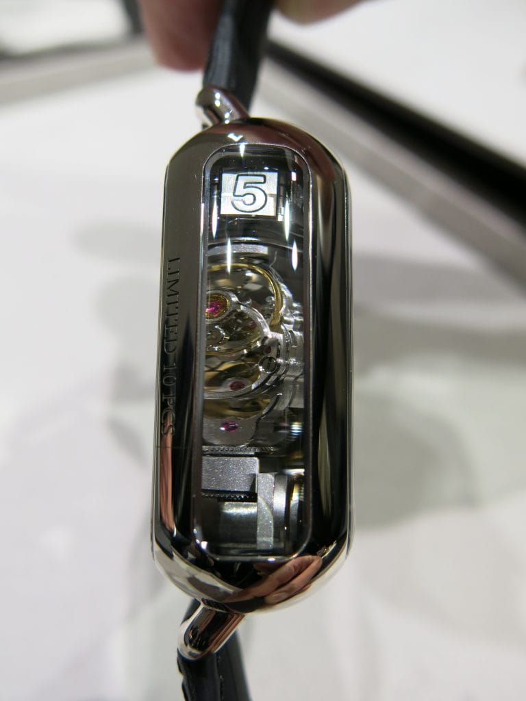 Son verso et son flanc transparents laissent apparaître l’intégralité du mécanisme avec son système de palettes articulé pour la chaîne de l’heure ainsi que le mouvement baguette dont l’organe réglant tourne de 60° à chaque changement d’heure.
