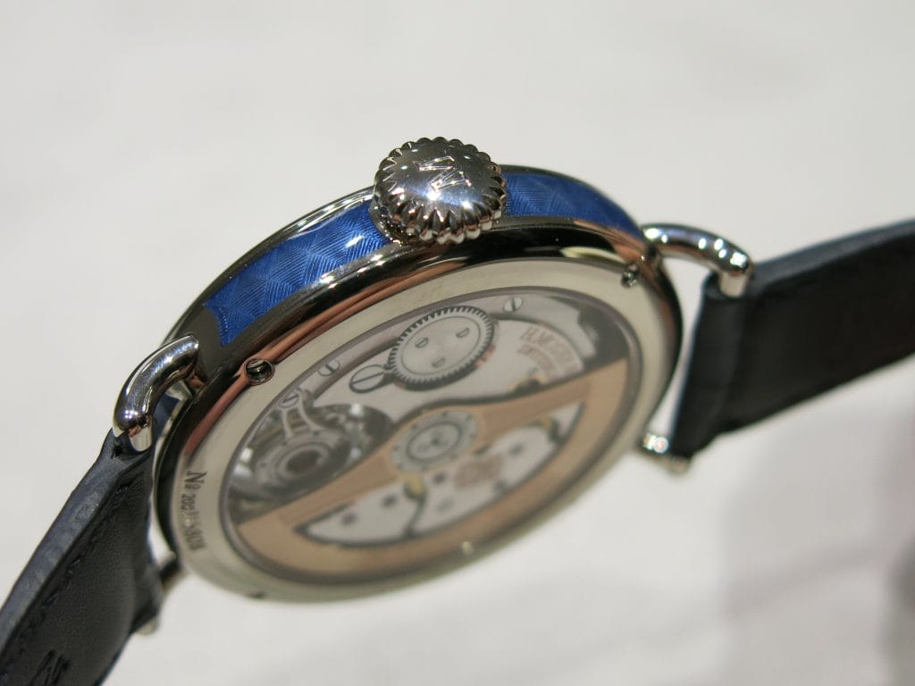 Si le mouvement maison est toujours le HMC 804 à remontage automatique doté de 3 jours de réserve de marche, un soin tout particulier a été apporté à l’esthétique de ce modèle. Le cadran est en émail grand feu blanc avec index en chiffres romains, les aiguilles affinées en queue d’hirondelle sont bleuies à la flamme. Et les flancs du boîtier sont subtilement gravés et ornés d’émail bleu de toute beauté.
