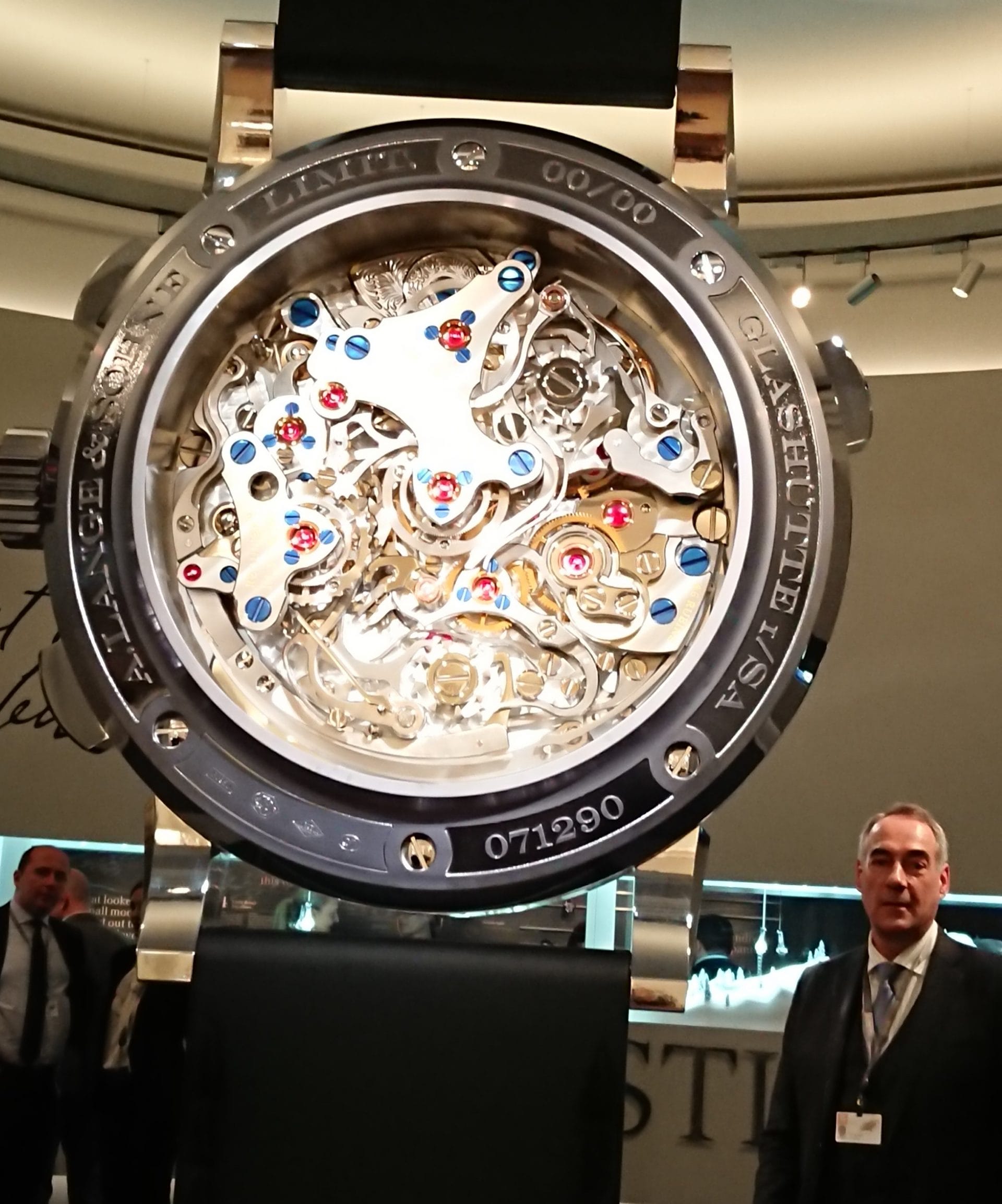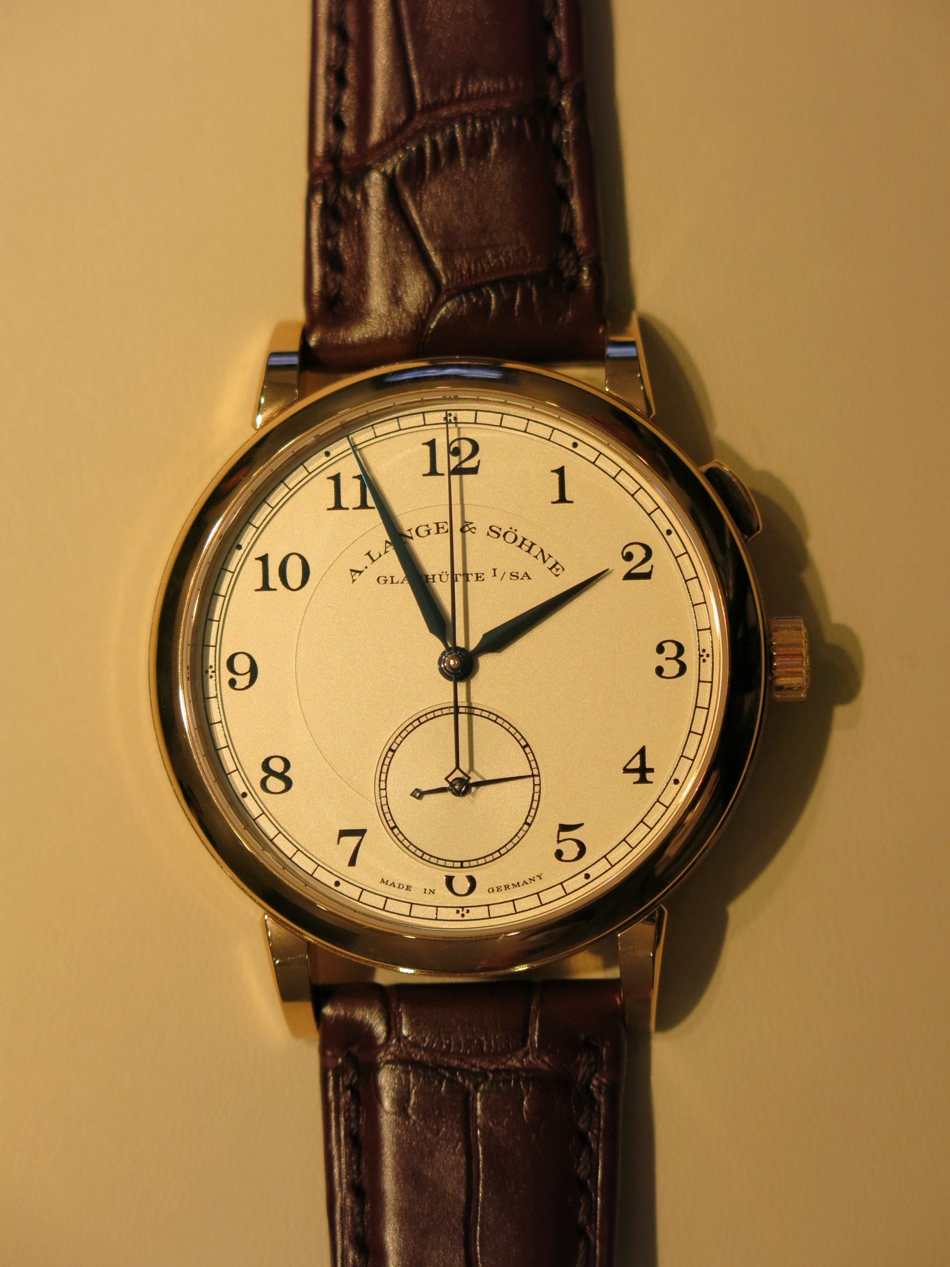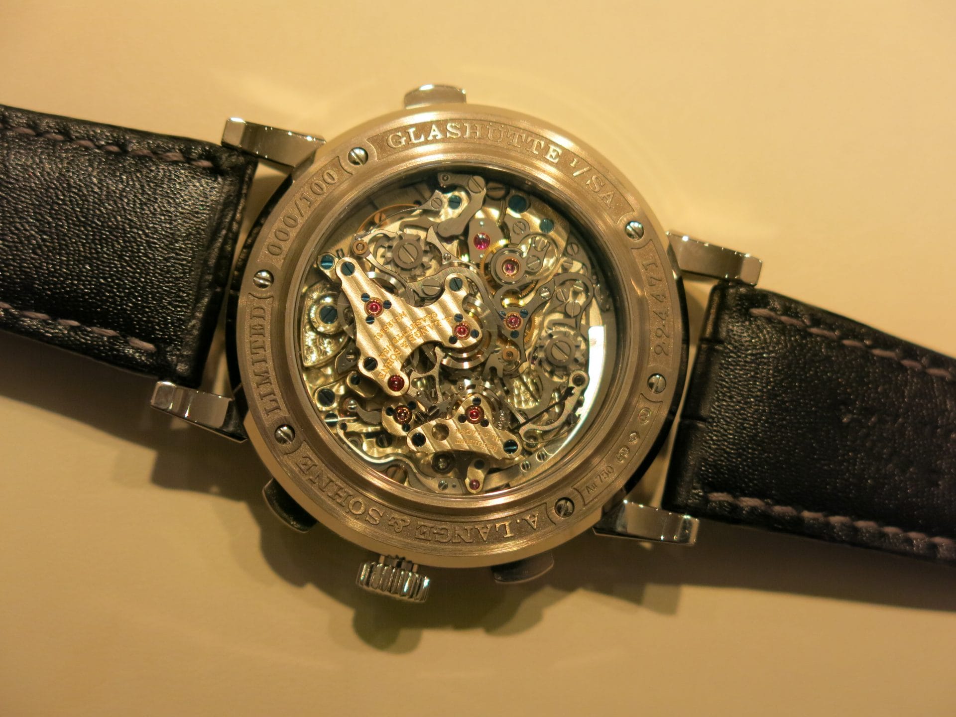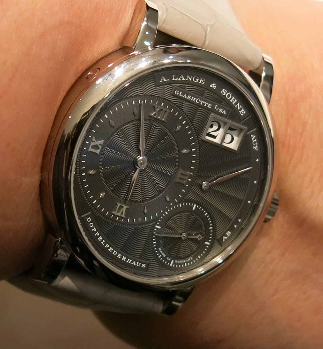 La particularité de cette montre – qui s’inscrit dans la lignée des 1815 – est de présenter deux trotteuses : une petite seconde classique à 6h mais aussi une grande seconde centrale inspirée d’une innovation du fondateur historique de la manufacture et arrière-grand-père de Walter, Ferdinand-Adolph Lange. Celle-ci est en effet une seconde morte (1 saut par seconde) continue mais qu’il est possible de stopper et redémarrer au moyen du poussoir à 2h.