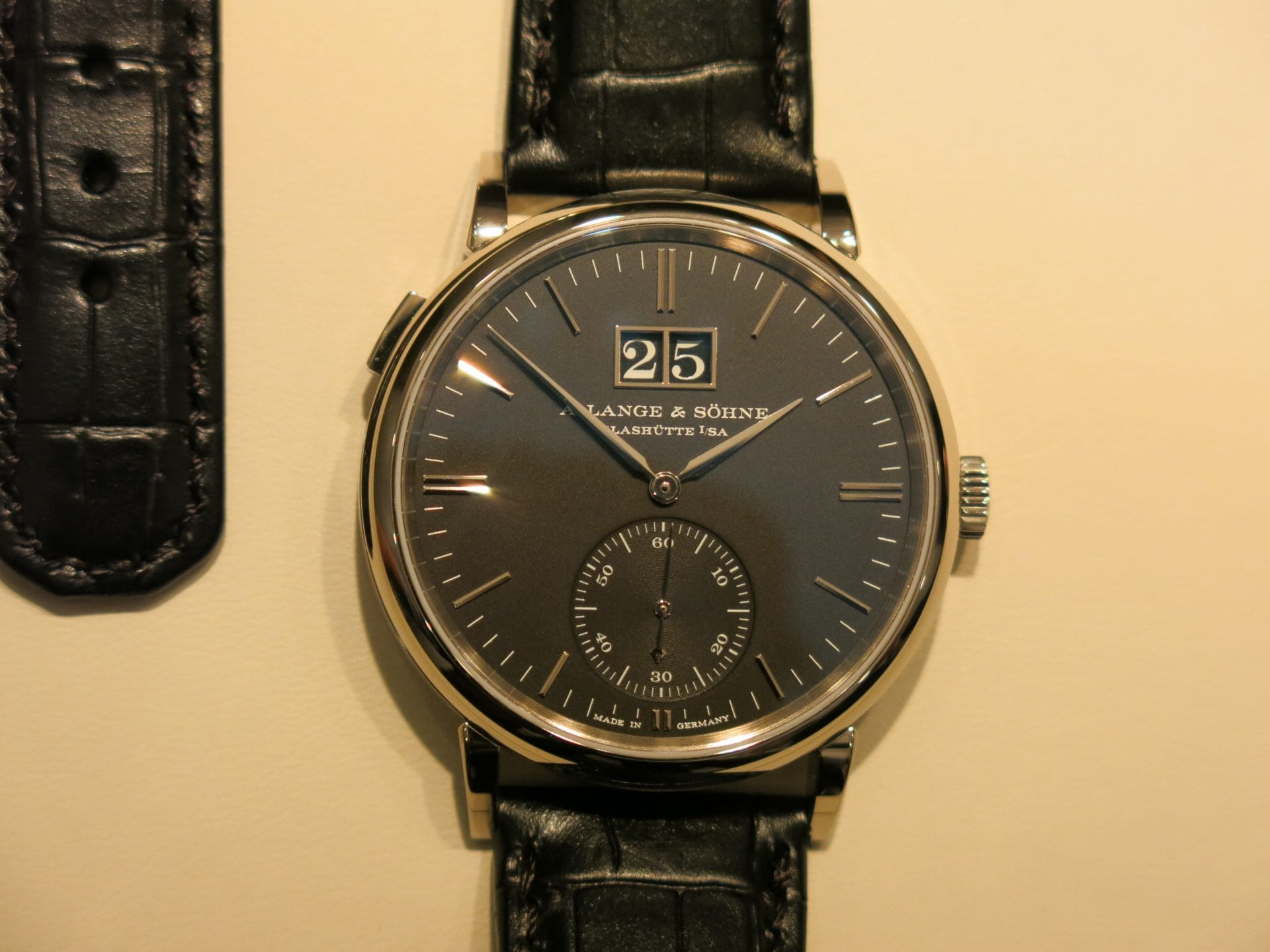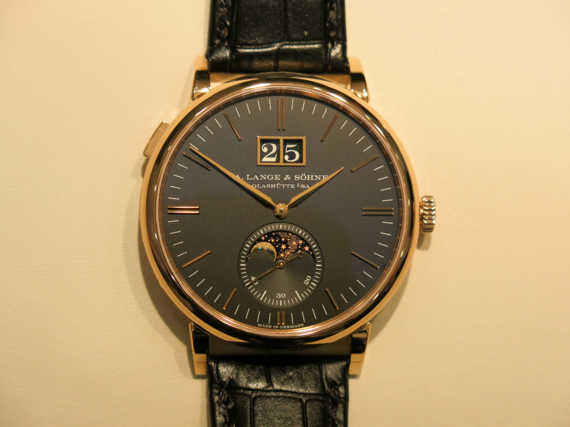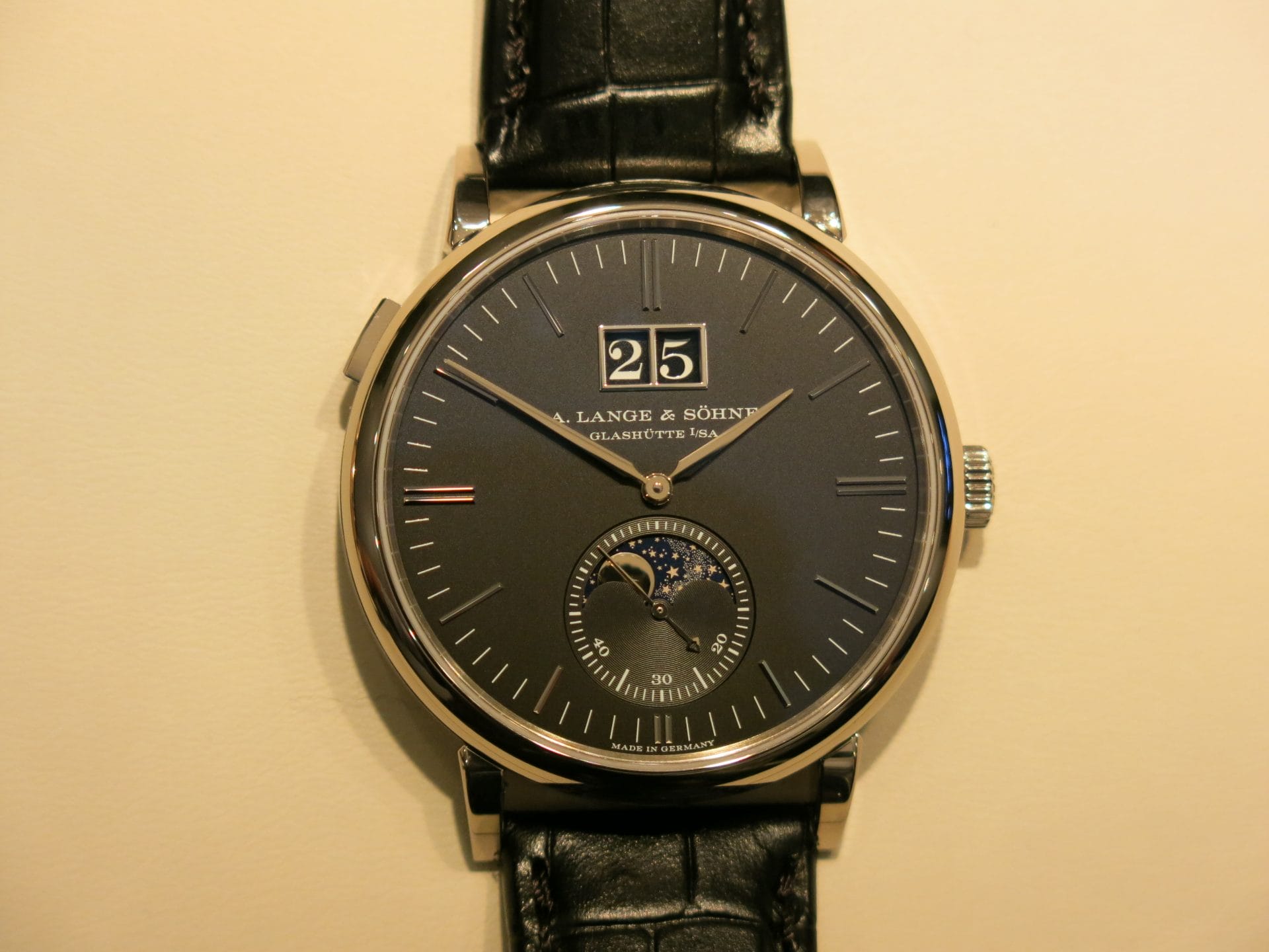 La Saxonia Grande Date 2018 est produite à son lancement dans un cadran en argent massif galvanisé noir et en 2 boîtiers possibles, or blanc ou or rose.