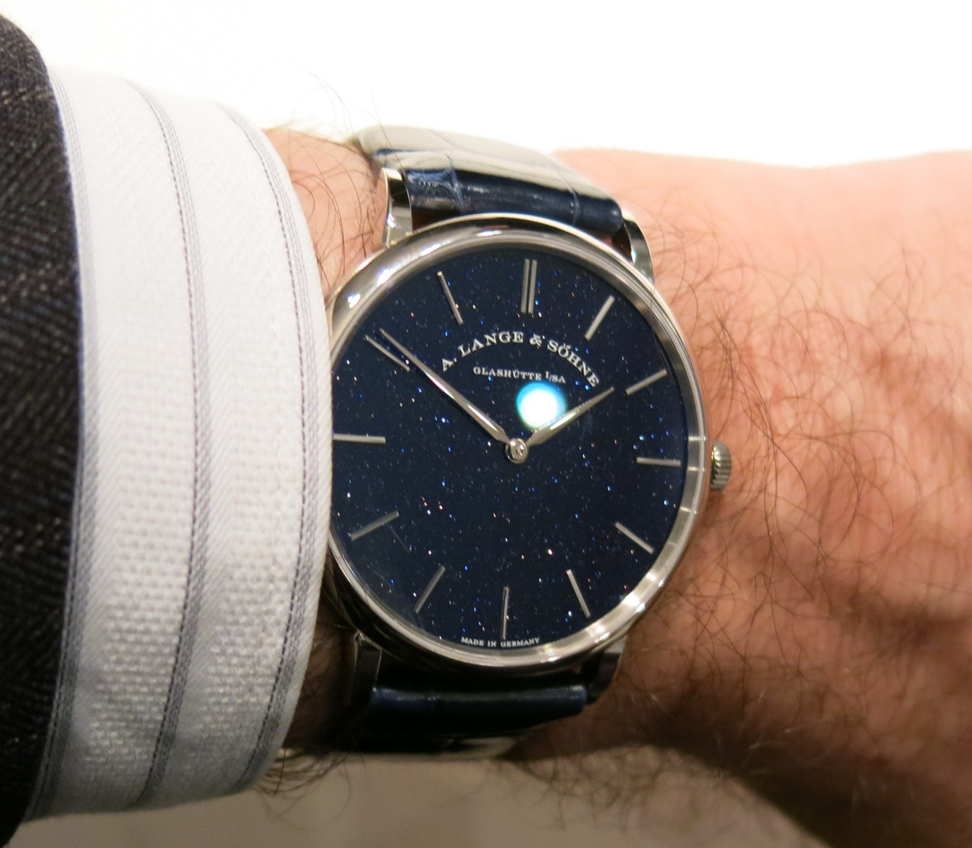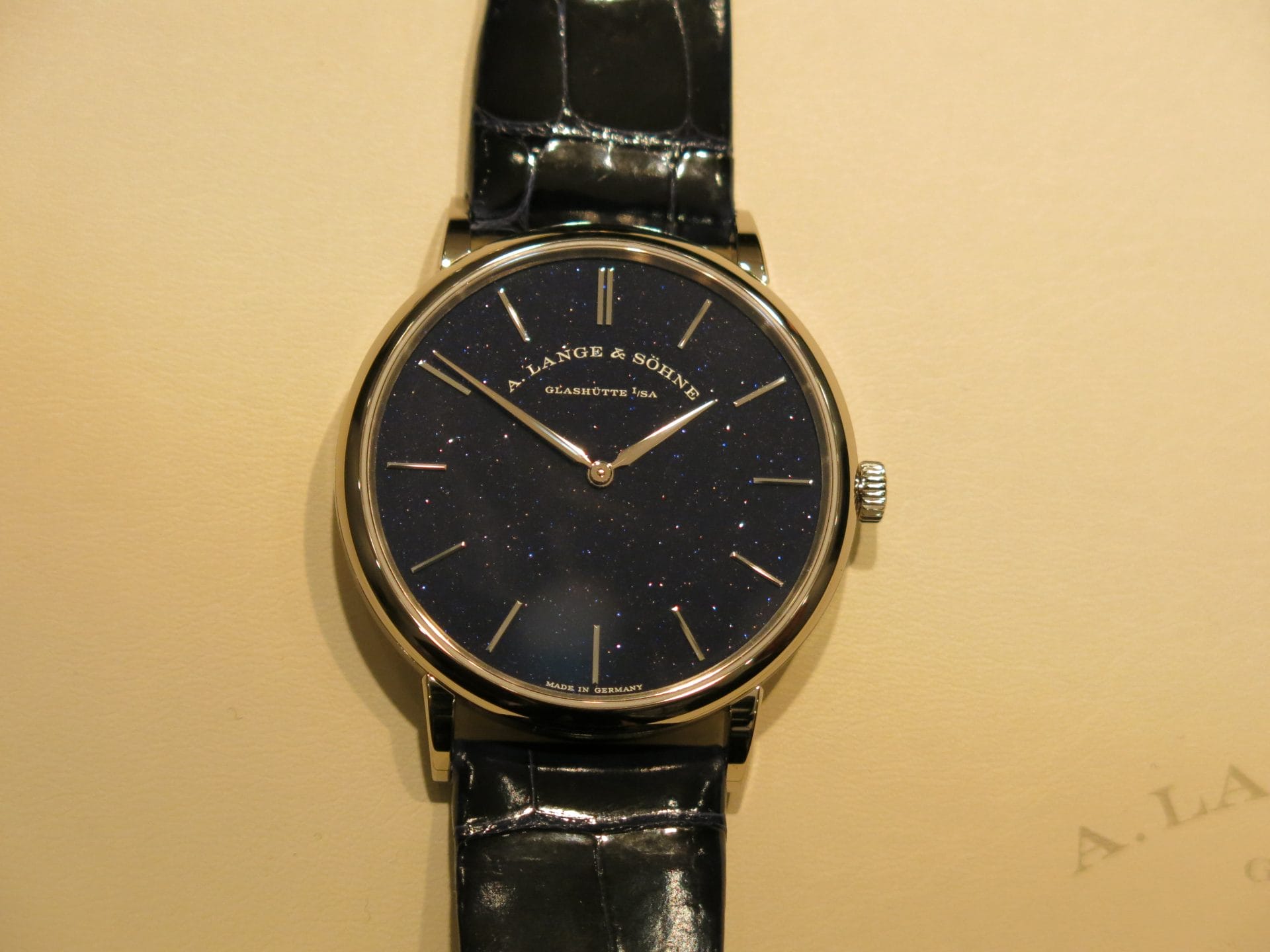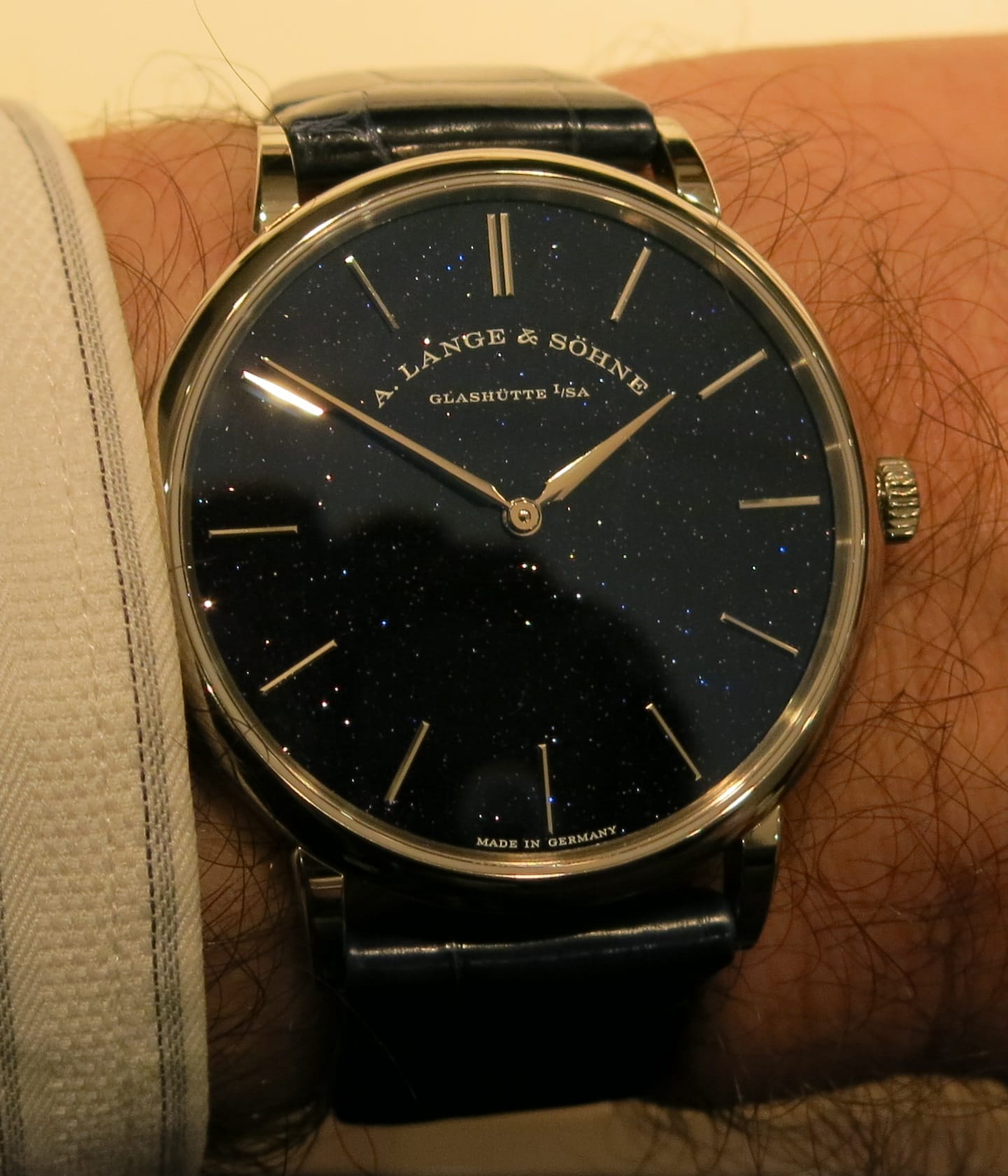 Autre modèle à l’esthétique raffinée, l’originale Saxonia Thin Blue Copper en 39 mm dont le cadran en argent massif est recouvert d’une très fine couche de verre aventuriné d’un bleu nuit du plus bel effet constellé de minuscules inclusions scintillantes d’oxyde de cuivre.