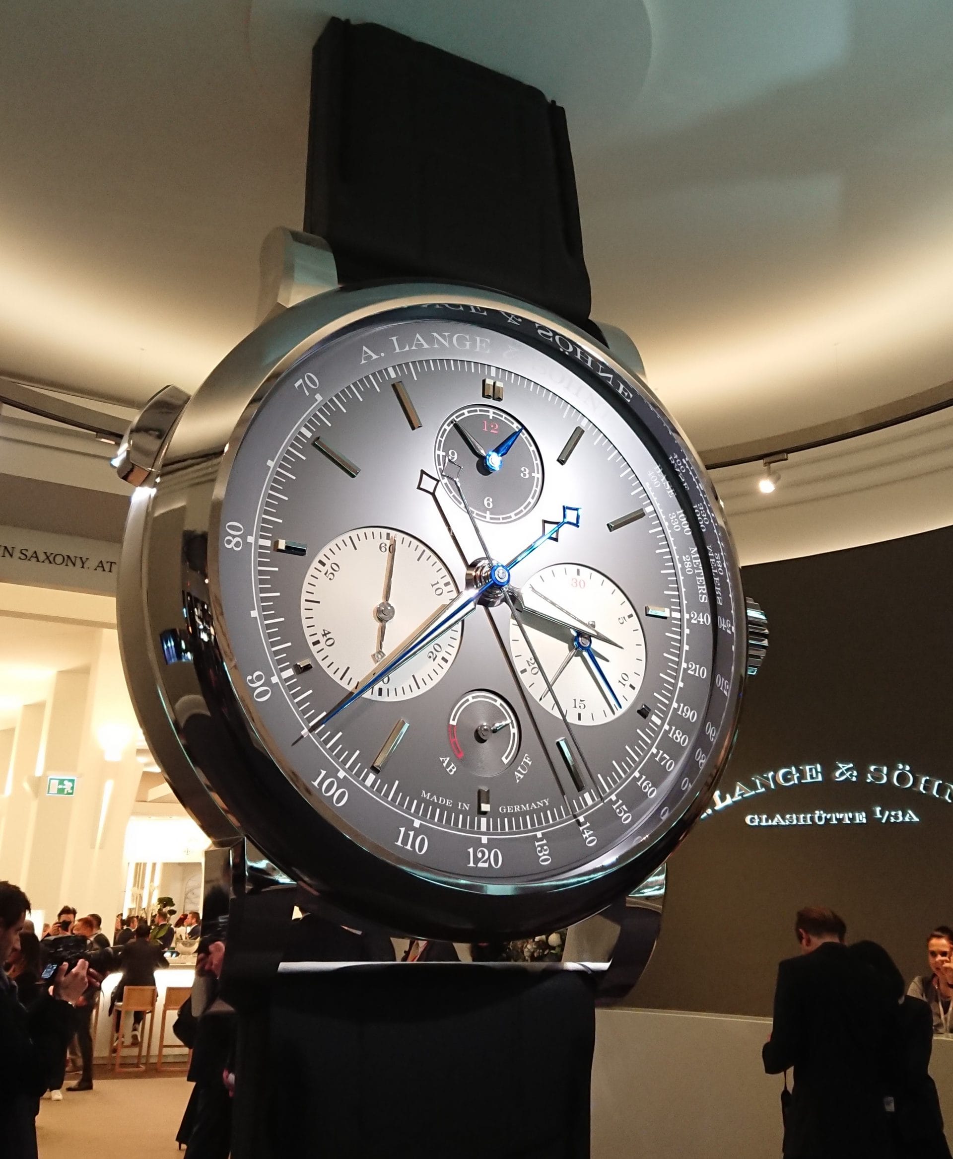 Et c’est bien sûr ce nouveau modèle superlatif qui figurait le totem géant accueillant les visiteurs sur le stand de la marque ! Là où le Double Split permettait jusqu’à présent de mesurer des temps intermédiaires jusqu’à 30 minutes grâce à ses 2 aiguilles rattrapantes bleues, l’ajout d’un affichage auxiliaire des heures écoulées à midi autorise désormais cette possibilité jusqu’à 12 heures.