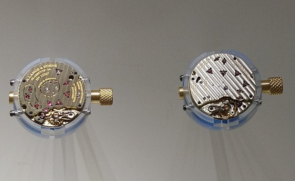 C’est seulement en ouvrant ce couvercle que l’on pourra observer le calibre à remontage manuel L121.1 (ici à droite) qui a pris en 2015 la suite du mouvement original L 901.0. Son double barillet lui confère toujours une réserve de marche de 72 heures mais il intègre quelques évolutions en particulier pour le réglage du balancier par masselottes d’équilibrage excentriques et au niveau de la distribution des trains de rouage.