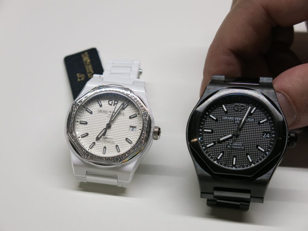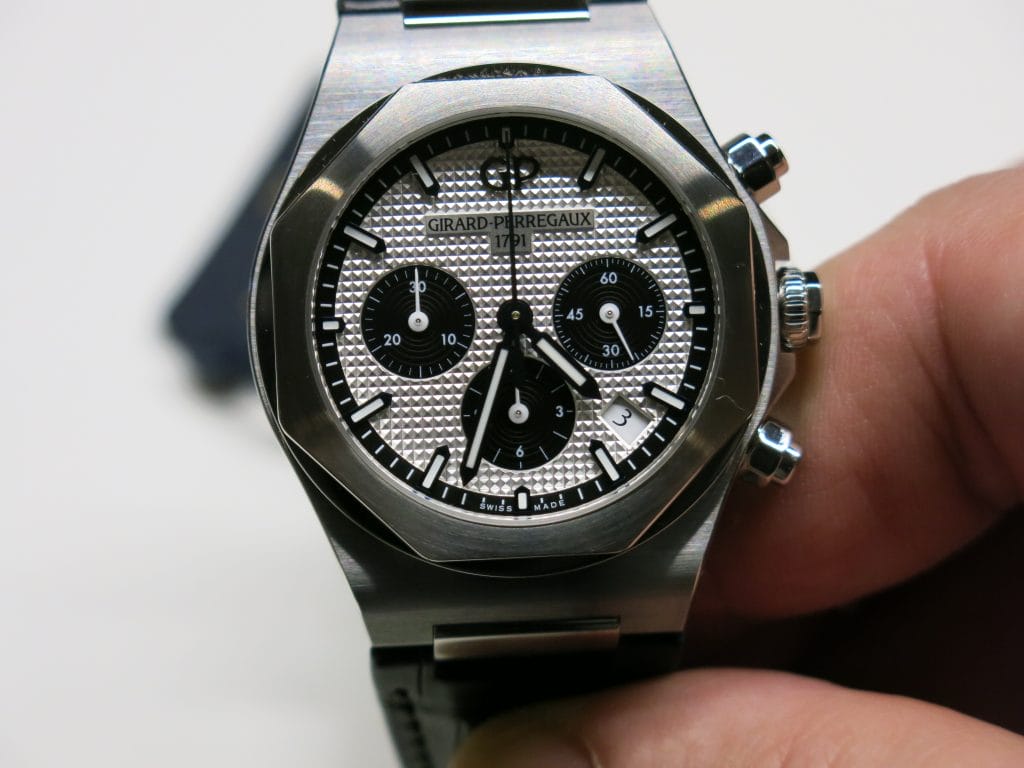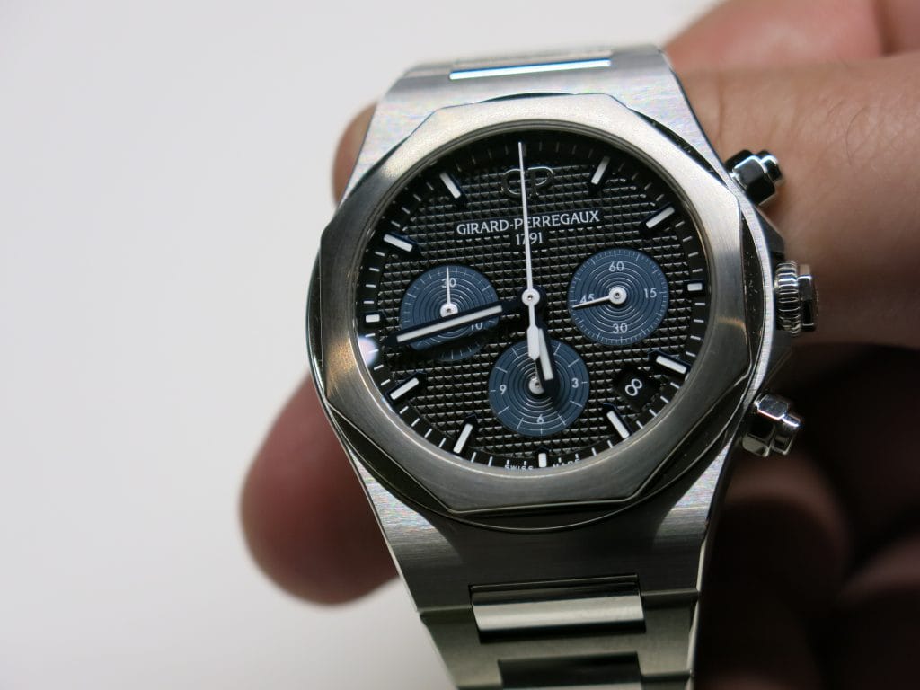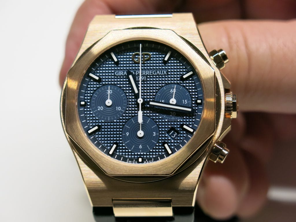 Nous commençons avec les Nouveautés Girard-Perregaux et l’arrivée cette année d’une version Chronographe de la Laureato en 3 jolies déclinaisons de cadran, chacune disponible en acier ou or rose, en 38mm ou 42mm de diamètre. La gamme est d’entrée suffisamment large pour permettre à chacune et chacun d’y trouver son modèle préféré.