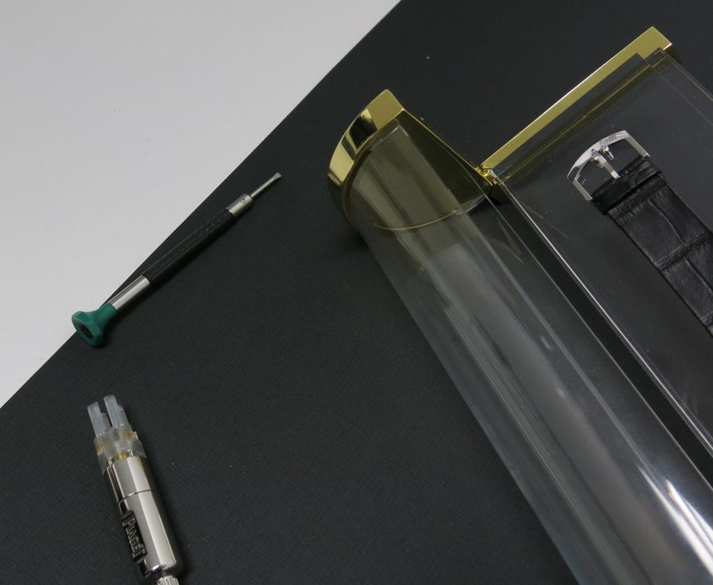 Remarquez que ce modèle « concept » à calibre manuel ne présente pas de couronne de remontoir classique, remplacée par une tige télescopique à embout plat qu’il faut d’ailleurs retirer pour, à l’aide de l’outil spécial que l’on distingue dans le coin inférieur gauche de cette photo, assurer le remontage du calibre manuel.