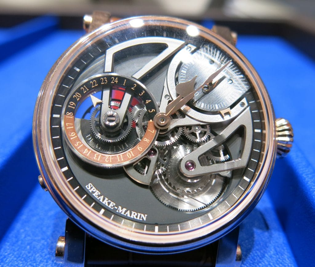 C’est donc naturellement que Speake-Marin poursuit sa stratégie sur la base de la One & Two avec le calibre SMA02 qui offre 2 fonctions supplémentaires très pratiques : une indication de date rétrograde autour du cadran de petite seconde et l’affichage à 9h d’un second fuseau horaire sur 24h.