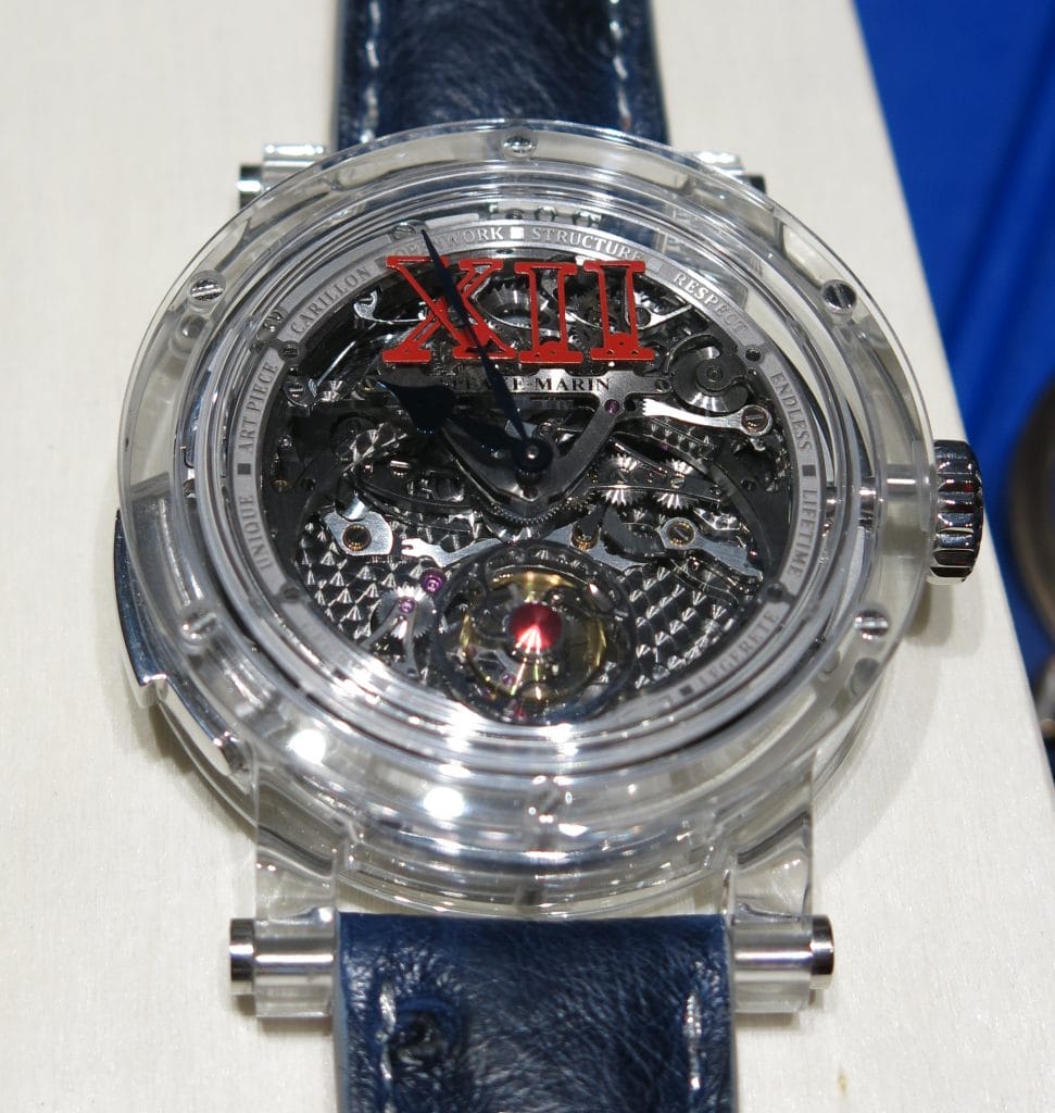 Mais l’exceptionnel cette année réside certainement dans cette pièce unique appelée « Légèreté », première répétition minute assemblée dans un boîtier ouvragé tout en saphir, qui plus est assorti d’un magnifique tourbillon dont la cage reprend le symbole de la marque. Ce modèle s’inscrit dans la lignée de l’étonnante « Crazy Skulls ».