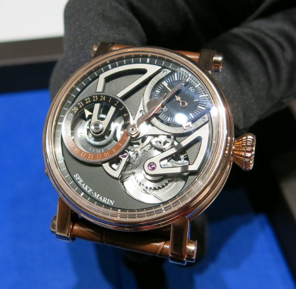 C’est donc naturellement que Speake-Marin poursuit sa stratégie sur la base de la One & Two avec le calibre SMA02 qui offre 2 fonctions supplémentaires très pratiques : une indication de date rétrograde autour du cadran de petite seconde et l’affichage à 9h d’un second fuseau horaire sur 24h.