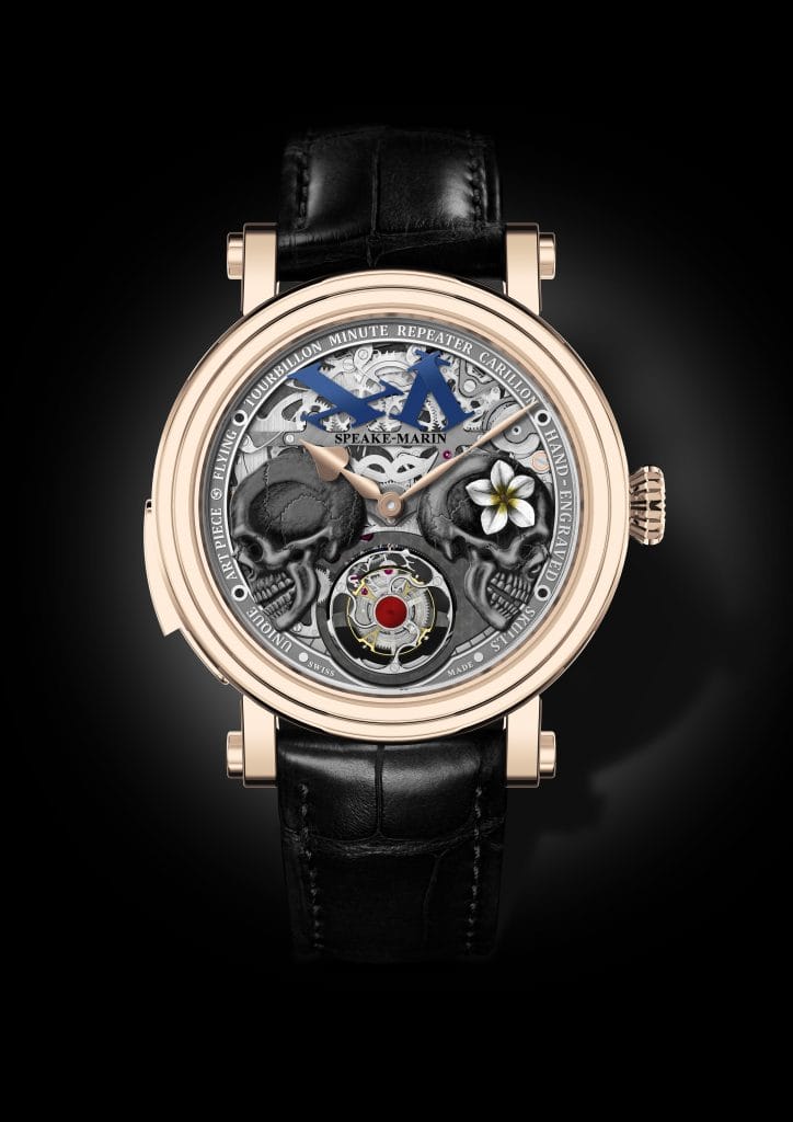 La nouvelle Crazy Skulls incarne parfaitement le savoir-faire et l’ADN de Speake-Marin en Haute Horlogerie: crânes gravés à la main, lunette et fond de boite en saphir et un époustouflant mouvement de Haute Horlogerie qui combine à la fois un tourbillon volant 60 secondes, et une animation double du cadran.