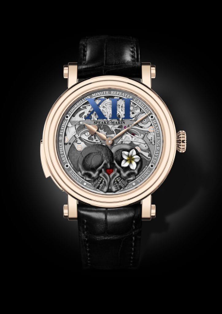 Les crânes gravés à la main cachent le Tourbillon Volant 60 secondes et forment un coeur lorsque ceux-ci sont fermés, comme un symbole de la complémentarité du couple. Le tourbillon symbolise aussi le battement du coeur, métaphore d’autant plus vraie qu’un tourbillon donne vraiment l’illusion que la montre est vivante.