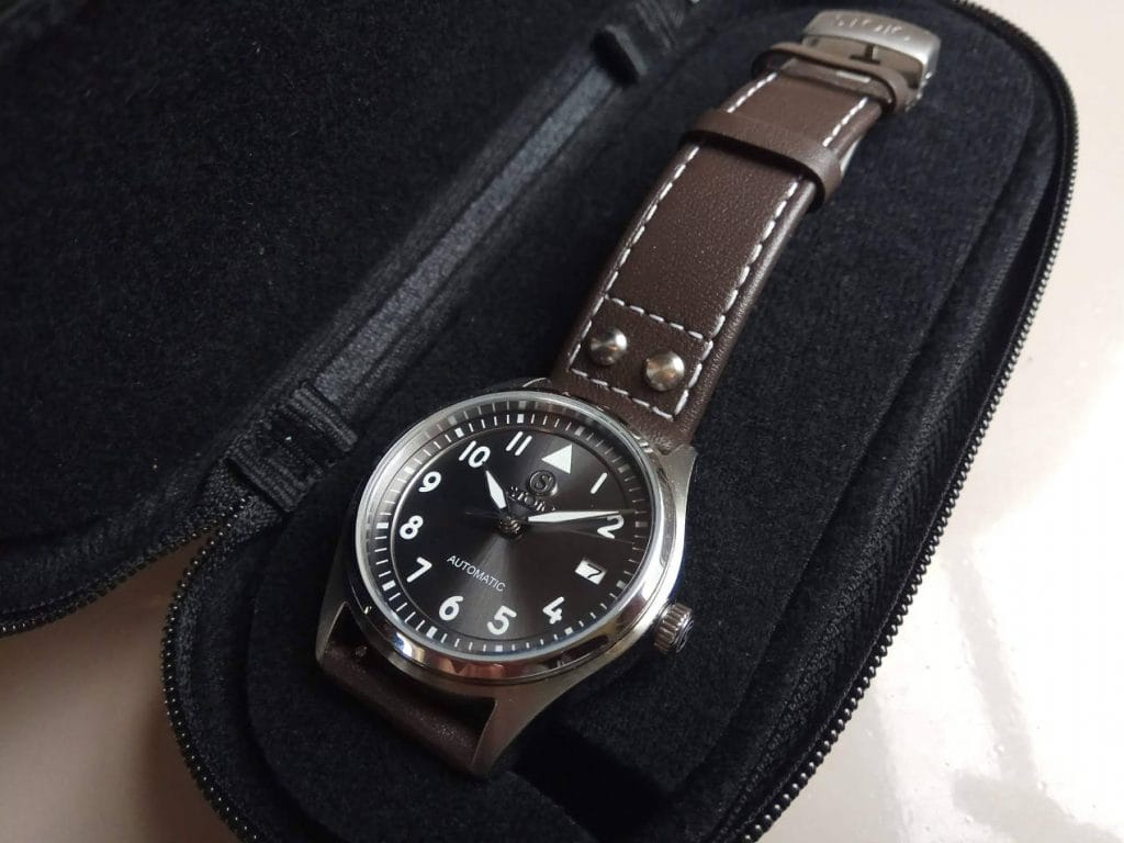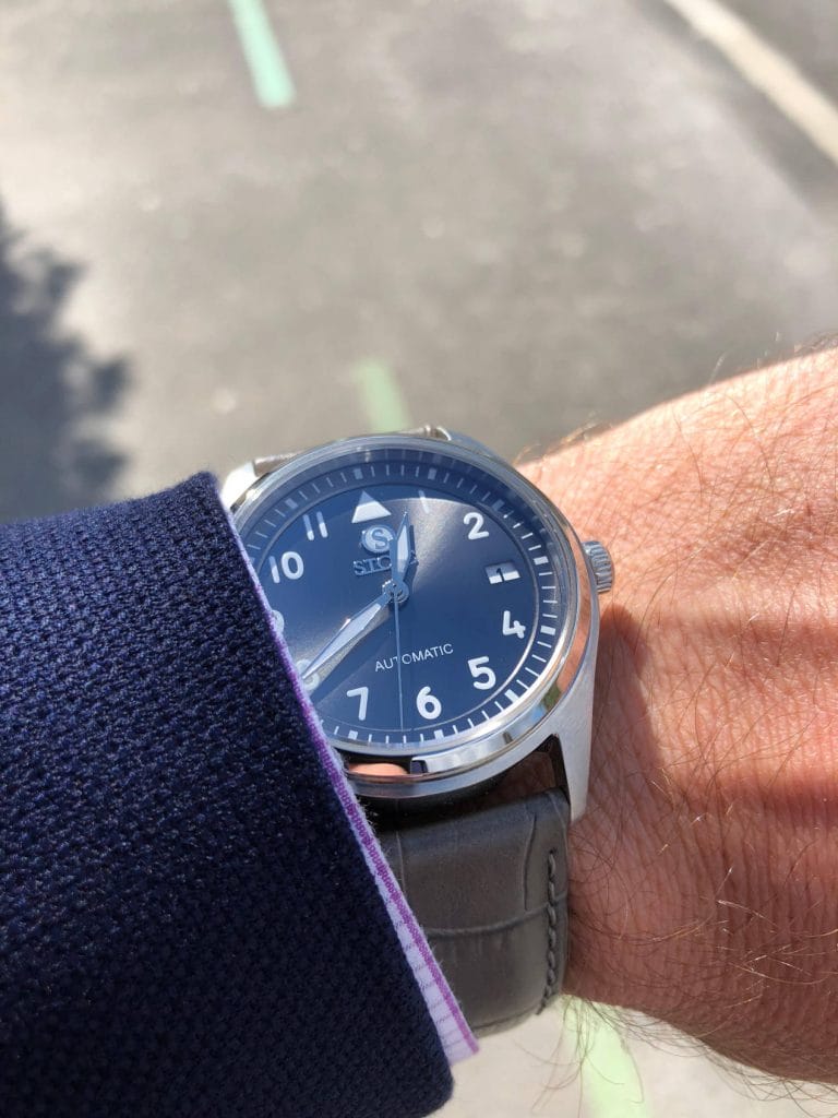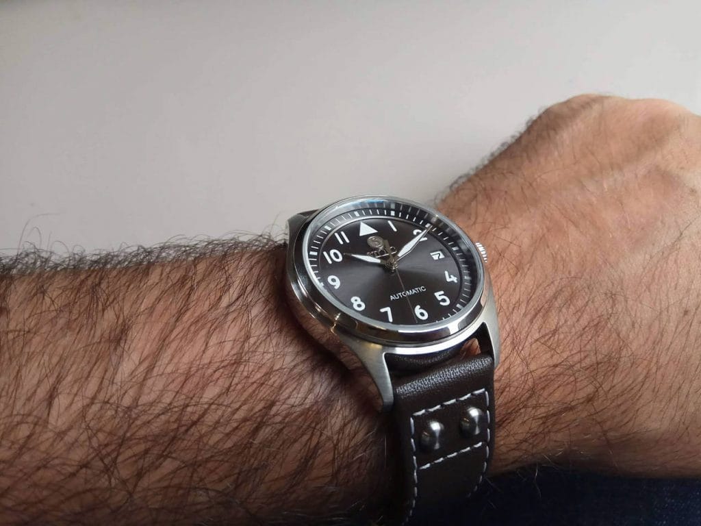 Et je peux vous assurer que cette montre a fait un tabac autour de moi. Son boîtier d’un diamètre raisonnable de 38 mm rend la montre attrayante autant pour les hommes que pour les femmes. La carrure brossée et la lunette polie attirent immédiatement le regard vers ce très beau cadran soleillé qui offre une lisibilité optimale grâce à ses index lumineux et ses larges aiguilles. Que ce soit un jeune ingénieur du son fan de John Mayer qui reconnaît le clin d’oeil à la Big Pilot de son guitariste préféré (on ne lui en voudra pas de ne pas connaître la Mark XVIII) ou le jeune retraité qui n’avait plus porté de montre automatique depuis son enfance, le succès est clairement au rendez-vous. Et quand on explique que le design répond au cahier des charges des montres de pilotes, ça rajoute une touche d’histoire toujours sympathique.