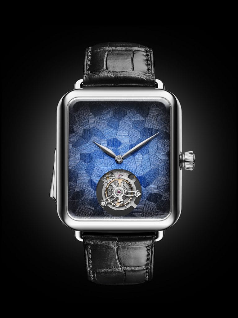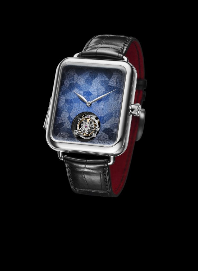 Pour cette première pièce unique, H. Moser & Cie. a développé une nouvelle esthétique. En effet, le cadran évoque une mosaïque de nuances bleues. L’alternance de surfaces, le jeu sur les finitions font référence au célèbre cadran Funky Blue de H. Moser & Cie., mais de manière abstraite et moderne. La Swiss Alp Watch Minute Repeater Tourbillon sera produite en différents exemplaires, tous uniques.