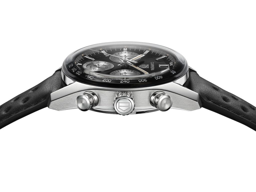 Une seule montre pouvait relever ce défi : la nouvelle TAG Heuer Carrera Chronograph, revisitée et perfectionnée pour sa septième décennie d’existence. Son boîtier est surmonté d’un verre saphir bombé évoquant les modèles des années 1970, mais avec un nouveau design permettant à la courbe de suivre avec fluidité l’échelle tachymétrique, tout en parcourant le bord du cadran.
