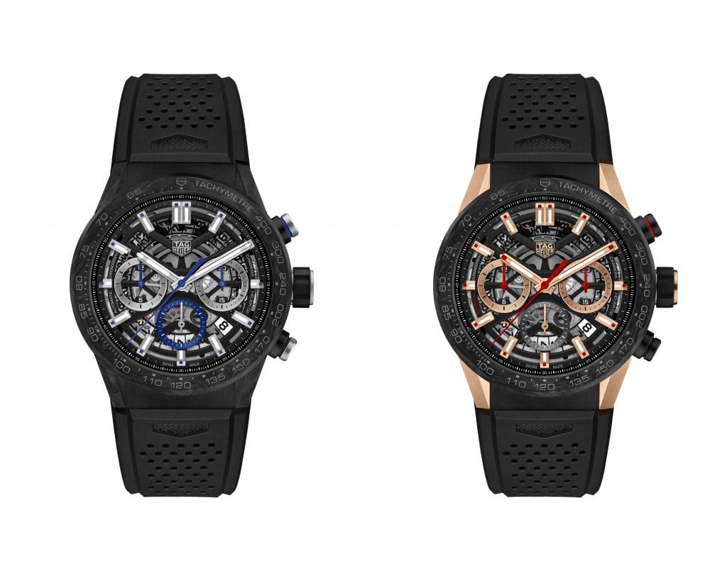 Le premier modèle marie habillement or rose et carbone. Disponible exclusivement en 350 exemplaires, cette TAG Heuer Carrera dispose de cornes, index, aiguilles et compteurs des heures et minutes en or rose. Ils viennent sublimer un cadran squeletté noir opalin et la lunette en carbone. Le deuxième modèle, disponible quant à lui en 750 exemplaires, arbore quelques touches de bleu sur son compteur des secondes et son aiguille centrales laquée. Le look ultra sportif de ces deux chronographes est accentué par un bracelet en caoutchouc perforé.