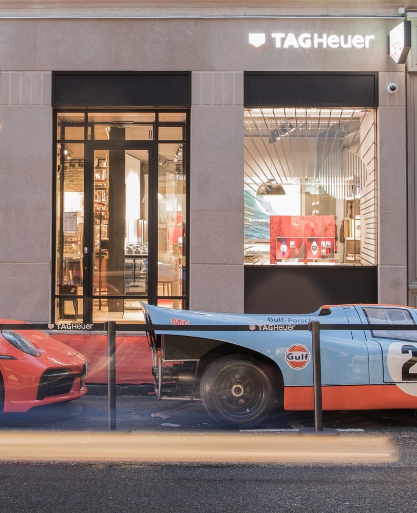 Pour célébrer l’inauguration, deux iconiques voitures de course étaient exposées devant la boutique le jour de l’ouverture, symbolisant le riche héritage de TAG Heuer dans le sport automobile. Les chanceux présents à cette ouverture ont en outre pu admirer la mythique Porsche 917K du film Le Mans de 1971, pilotée par Steve Mc Queen portant une Heuer Monaco au poignet.