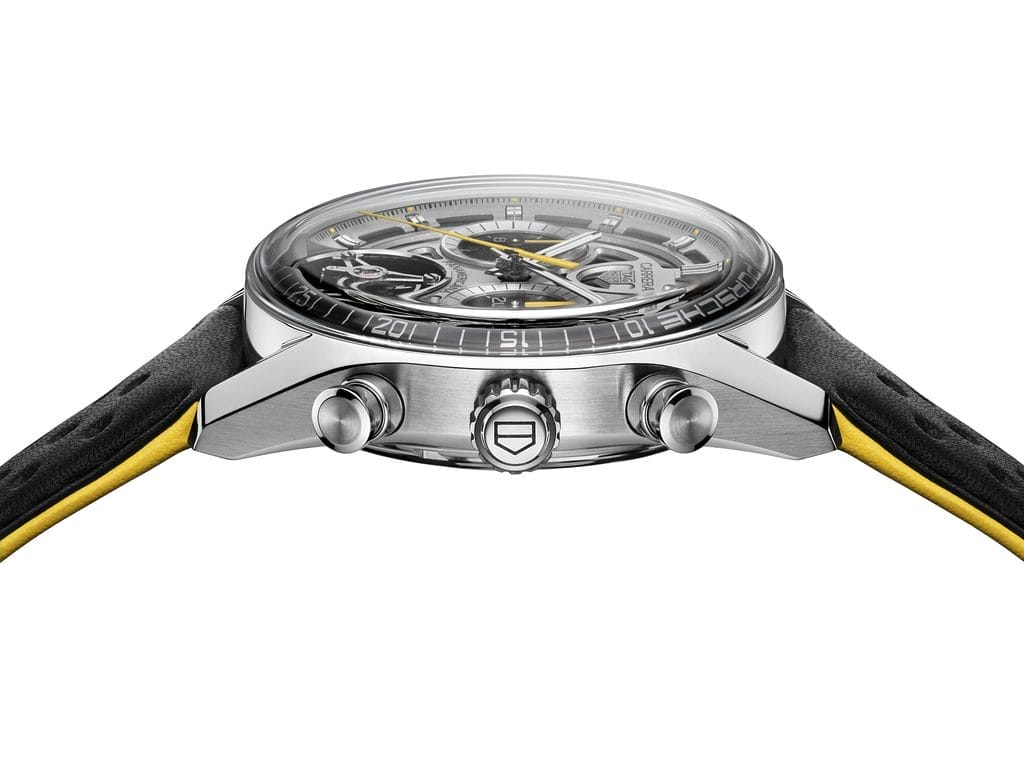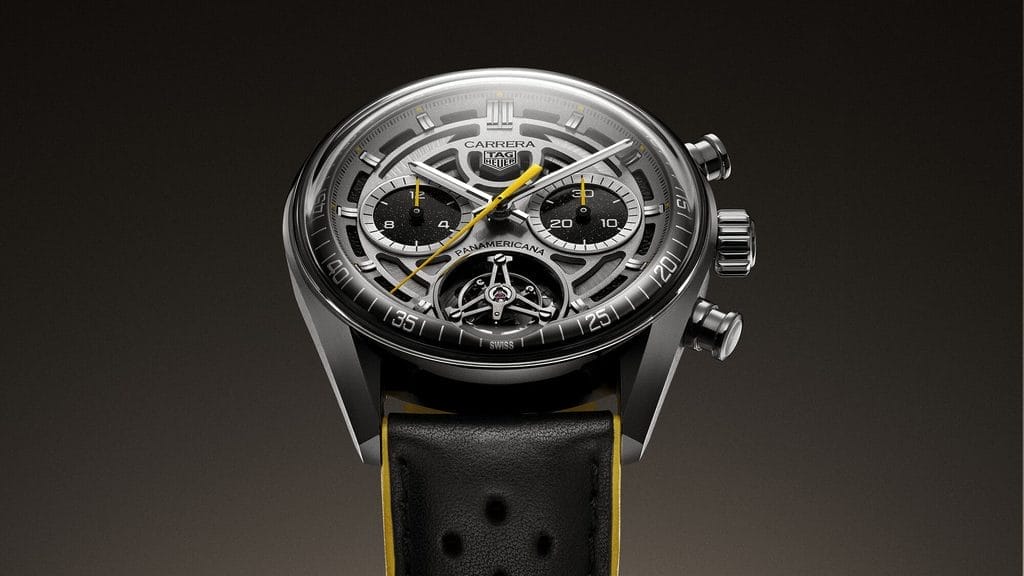 La TAG Heuer Carrera Chronograph Tourbillon x Porsche Panamericana poursuit cet héritage d’innovation. Lancée lors de la Carrera Panamericana, cette montre rend hommage à l’histoire partagée entre TAG Heuer et Porsche, célébrant leur collaboration dans le monde du sport automobile et leur passion commune pour la précision et la performance. Le design de la montre est directement inspiré de la Porsche 550 Spyder, avec des éléments qui évoquent les jantes de la voiture et les couleurs argentée, jaune et noire qui rappellent son esthétique. Les aiguilles jaunes laquées des sous-compteurs et la trotteuse apportent une touche de sportivité supplémentaire à ce modèle déjà très dynamique.