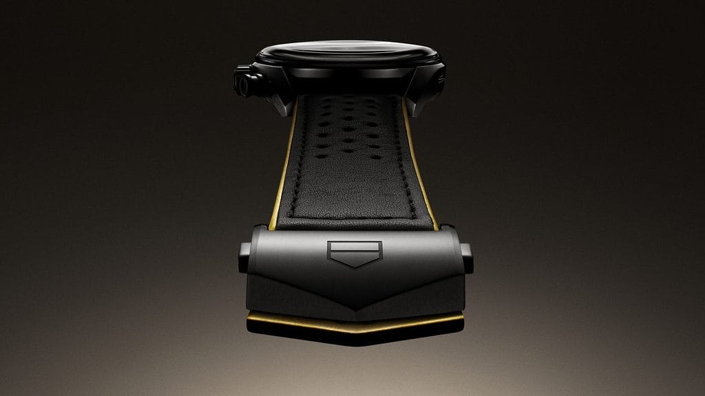 Le bracelet en cuir de veau perforé noir, avec des coutures et une doublure jaunes, ajoute une touche sportive et vintage à la montre. Ce modèle haut de gamme est accompagné d’un écrin noir laqué, personnalisé aux couleurs jaunes Pantone de la montre, soulignant ainsi son caractère exclusif.