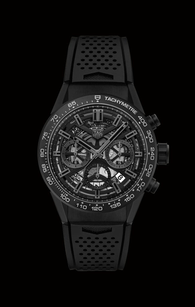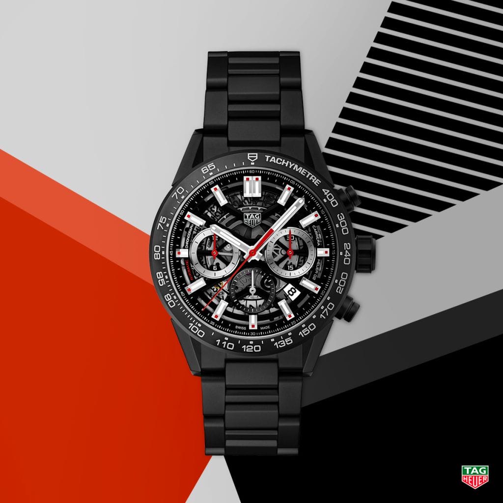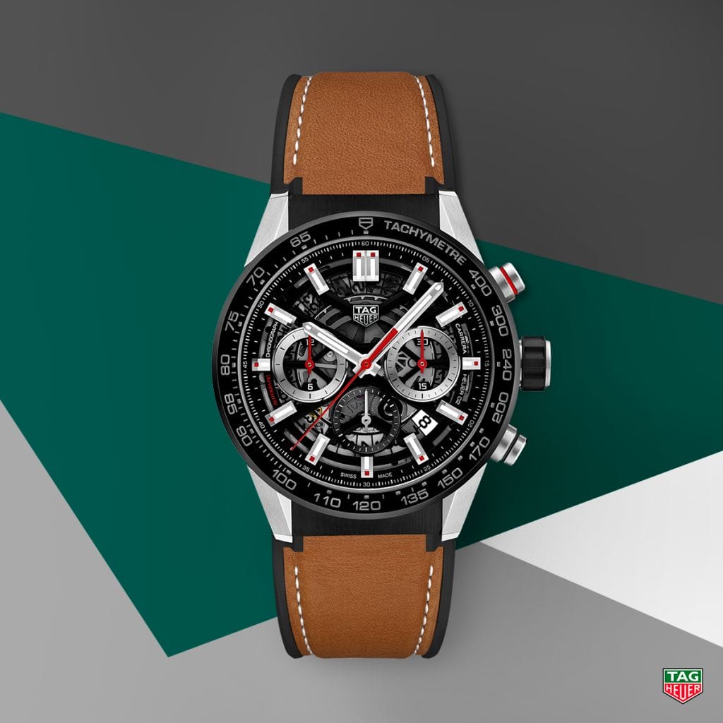 Signe distinctif des plus récents modèles TAG Heuer Carrera, le cadran squeletté, doublé d’un fond en saphir. Ils dévoilent ici une mécanique de pointe conçue en interne : le calibre Heuer 02. Porté par l’icône Heuer Carrera, ce chronographe automatique de manufacture, développé et produit par TAG Heuer, intègre 168 composants dont une roue à colonnes et un embrayage vertical, signatures de haute horlogerie. Moderne, précis et fiable ce mouvement mécanique bat à la fréquence de 4 Hz et dispose d’une autonomie de 80 heures stockée dans un seul barillet. Sa spécificité : il a été conçu dans une optique de production industrielle et de simplification des opérations d’assemblage et de service après-vente.