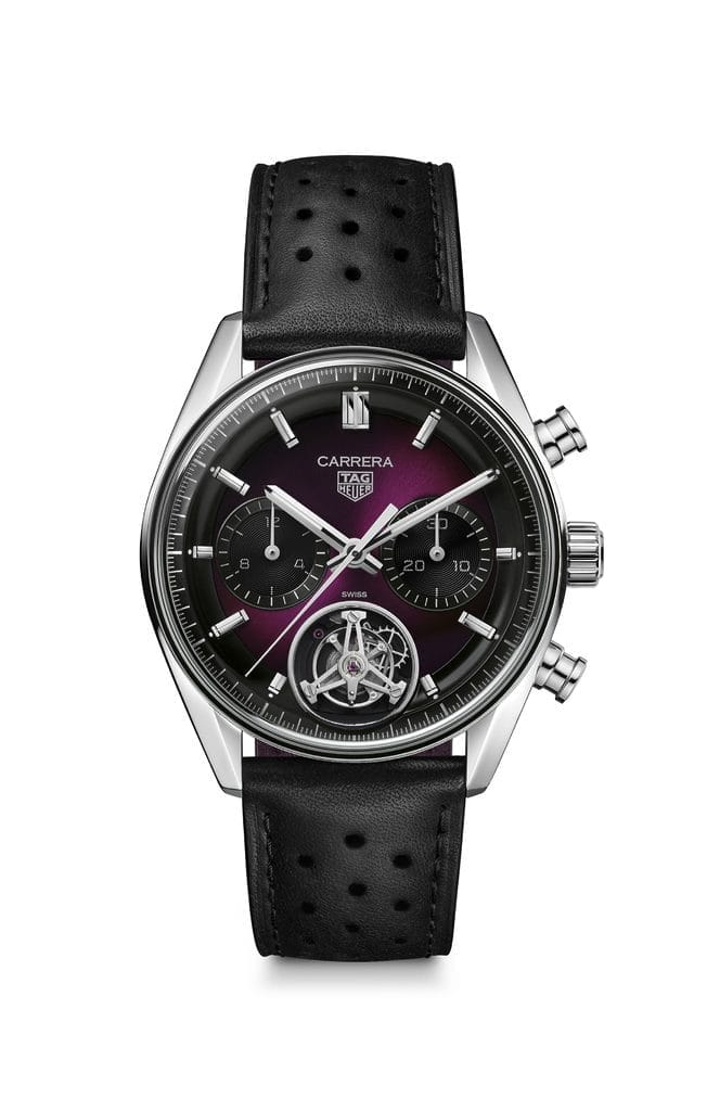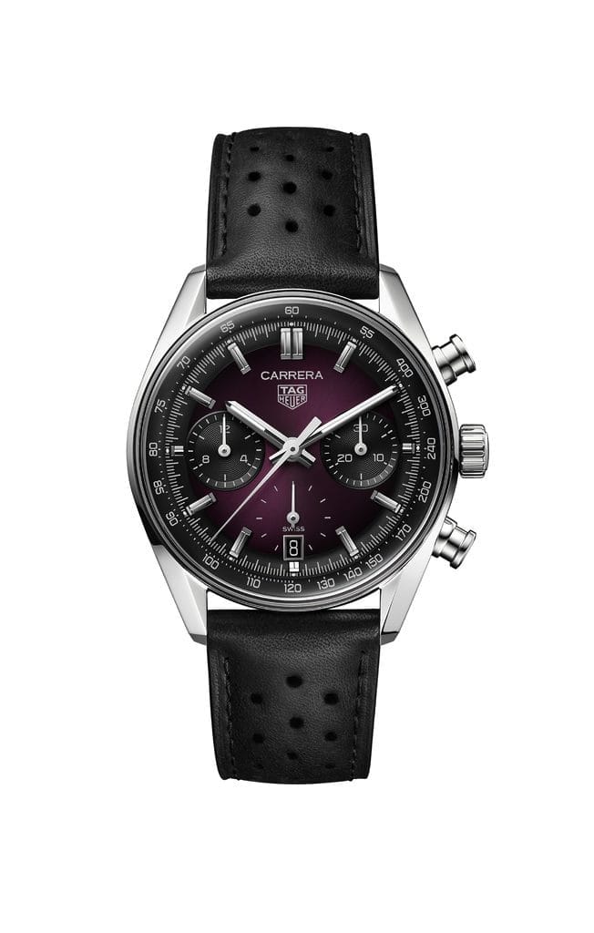 Inspirée par le succès de la TAG Heuer Monaco Chronograph violette, la Carrera adopte cette teinte audacieuse dans ses nouvelles déclinaisons. Le cadran brossé soleillé présente un dégradé fumé allant du noir intense au bord jusqu’au violet éclatant au centre, sublimant la profondeur du design.