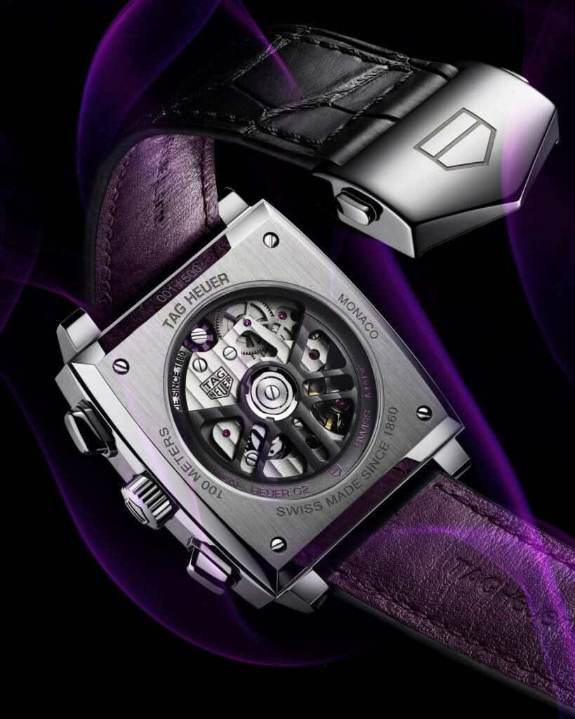 Dans cette interprétation de 2022, le mouvement de chronographe de manufacture TAG Heuer, le Calibre Heuer 02, est clairement visible à travers le fond du boîtier en glace saphir. Il présente une masse oscillante, une roue à colonnes et des gravures spéciales aux détails violets. Ce mouvement offre des performances de mesure du temps exceptionnelles et une réserve de marche de 80 heures. Détail spécial supplémentaire, le bracelet en cuir d’alligator noir est assorti d’une doublure intérieure violette. Le fond du boîtier porte la gravure du nombre de la pièce sur XXX/500.